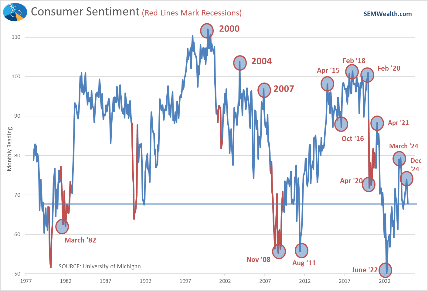 The thing that continues to surprise is Stock Prices. Stocks are a leading indicator because over the longer-term stock prices rise and fall based on the underlying economic performance of each company. If Wall Street believes earnings are going to slow, stocks will fall. For now, stocks and consumer spending are the only indicators pointing to "above average" growth. Which one is right? Will tariffs and weak consumer sentiment mark the end of the bull market or will we see resilience that eventually drags the rest of the economy higher?