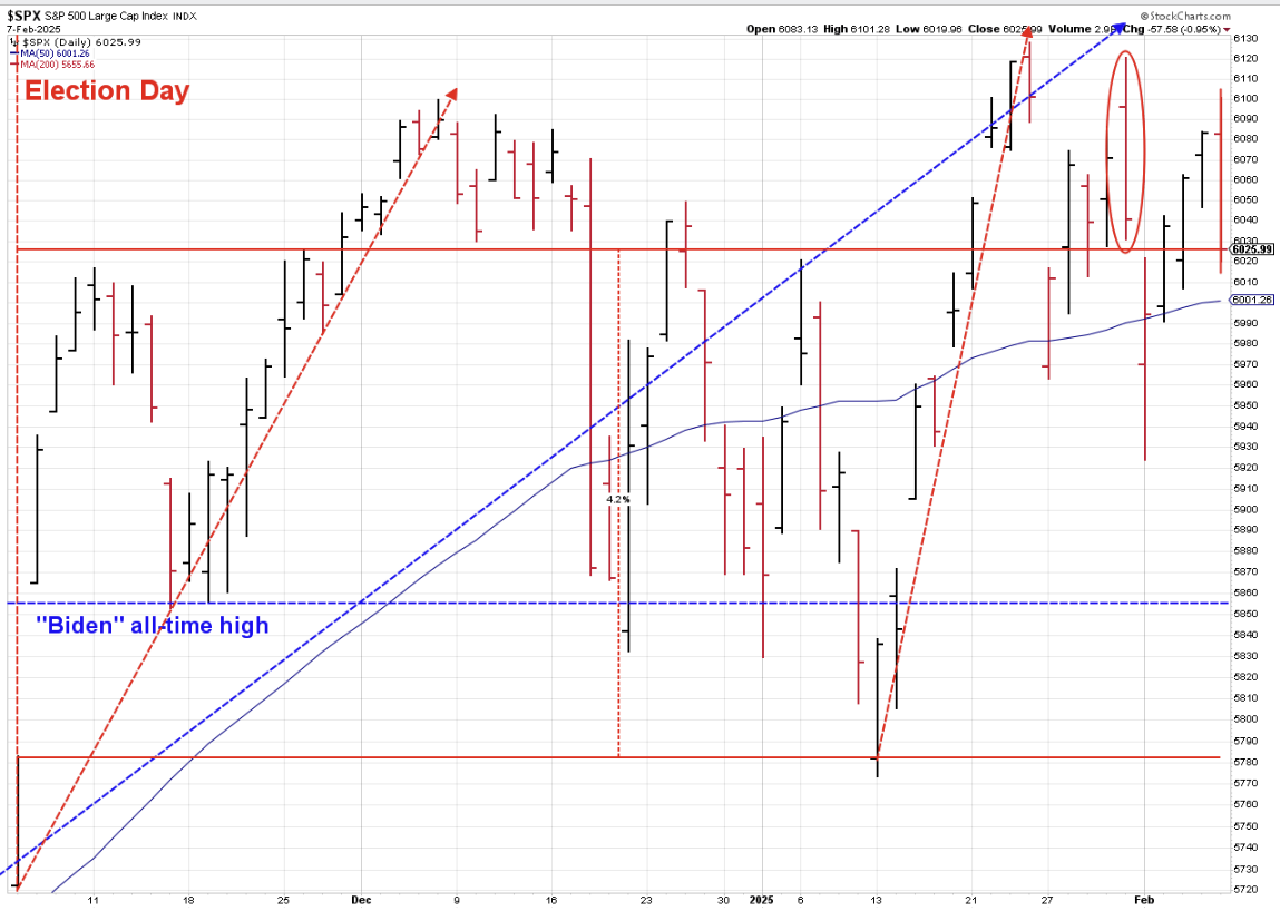 The Trump 2.0 Chart, which shows the S&P 500 daily fluctuations since the election shows how volatile the market has been so far. For the 2nd Friday in a row, rumblings from the President about additional tariff actions led to stocks closing Friday near the lows of the day.