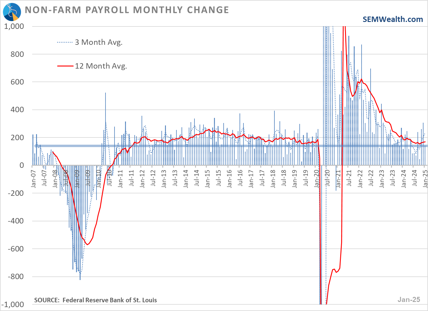 The overall jobs picture looks like this. One month does not make a trend, but the number for January was below an already 'weak' 12-month average. It is generally thought a 'healthy' economy produces around 200-225K jobs per month. The 3-month average is still above that level at 250K, so everyone will be watching to see whether or not January was just a temporary blip.