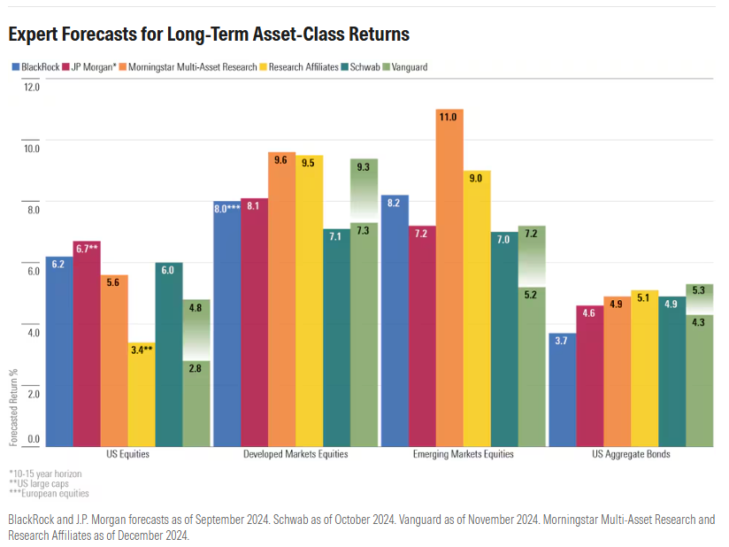 The big name firms are all forecasting returns over the next 10 years for US stocks to be well below average, international stocks to outperform the US and for bonds to generate returns just below stocks.