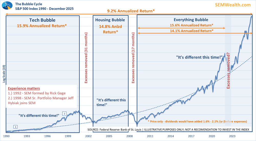Everyone is saying the same thing about "AI" as they were about the technology revolution of the 90s. I fully expect (most of) those predictions to come true. However, that doesn't mean stocks will suddenly continue compounding at a 14-15% annualized rate rather than the long-term rate of 9-10% (which is the same rate we've enjoyed going back 50 & 100 years!) Excesses have always been removed when we get to these types of expectations and is something we should plan for.
