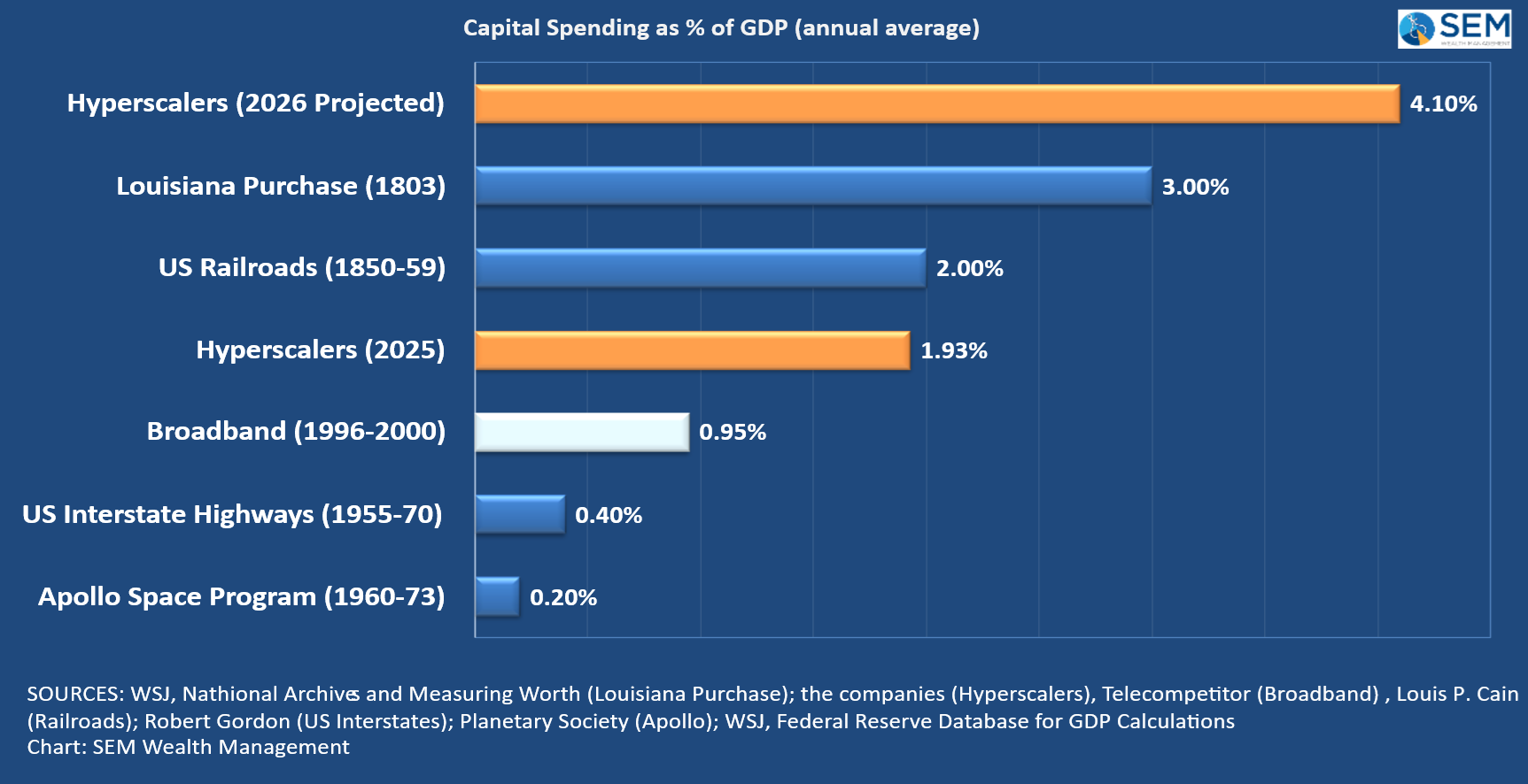 Our economic model has obviously been out of alignment with the growth of the stock market. It went "neutral" in August 2024 and then bearish in July 2025. This came at a time of very strong S&P 500 earnings growth. While it is difficult to get an exact number, spending on data centers in 2025 represented 1/3 to 1/2 of our GDP growth last year. The 4 so-called "Hyperscalers" (Alphabet, Microsoft, Amazon, and Meta) spent 2% of GDP in 2025 and are projected to spend 4% of GDP in 2026. Without that spending, it is clear our economic model would have been correctly "bearish" and we would be looking at a recession.