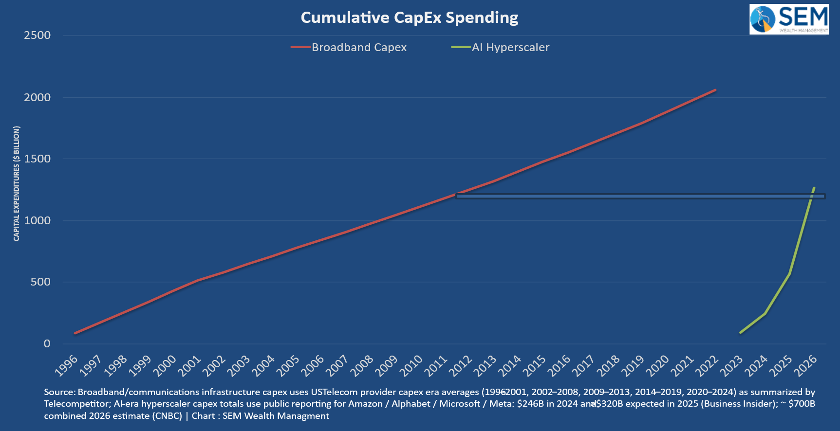 To put the spending in perspective, I plotted the cumulative spending to buildout our broadband network with the cumulative spending of these 4 "Hyperscalers". In 3 years, these companies have spent 15 years' worth of "broadband" investments.