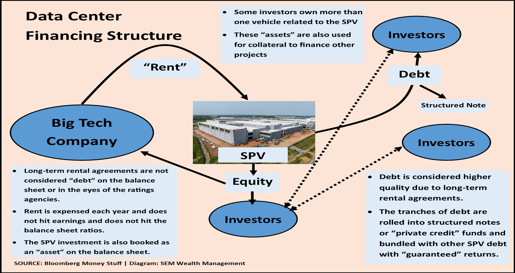 Throughout the 4th quarter, I lamented how my accounting brain was becoming increasingly uncomfortable with the creative financing for these data centers. Whereas early investments were from "free cash flow", most of the new data centers being developed last year were tapping the "private" markets. I put together this diagram illustrating how these deals work: