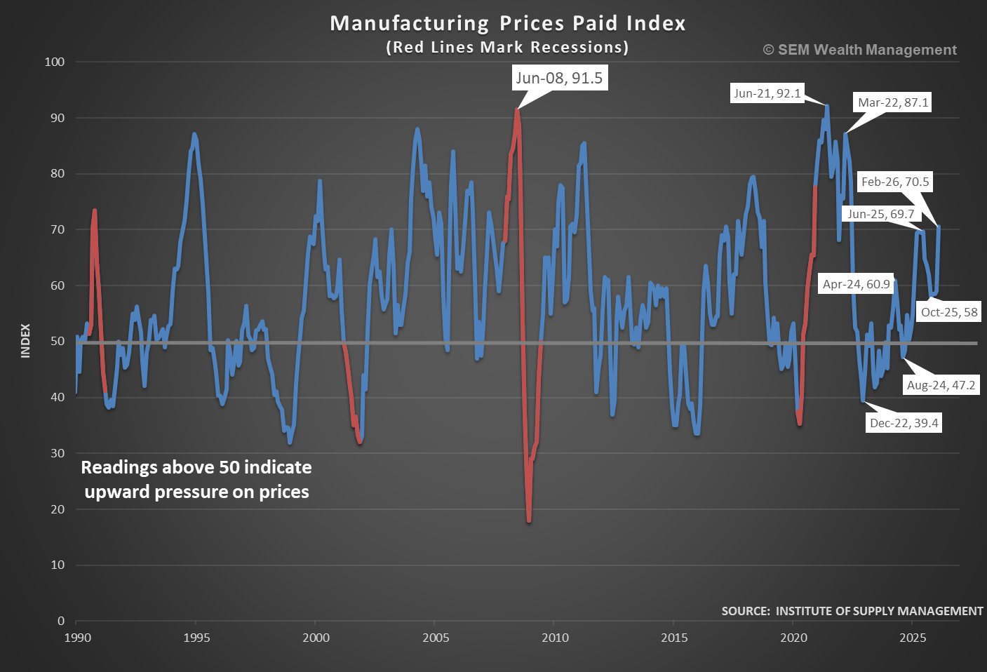 The bigger problem is, the inflation pressure isn't just due to the attacks on Iran. The ISM Manufacturing Prices Paid Index spiked to the highest levels since 2022 in February.