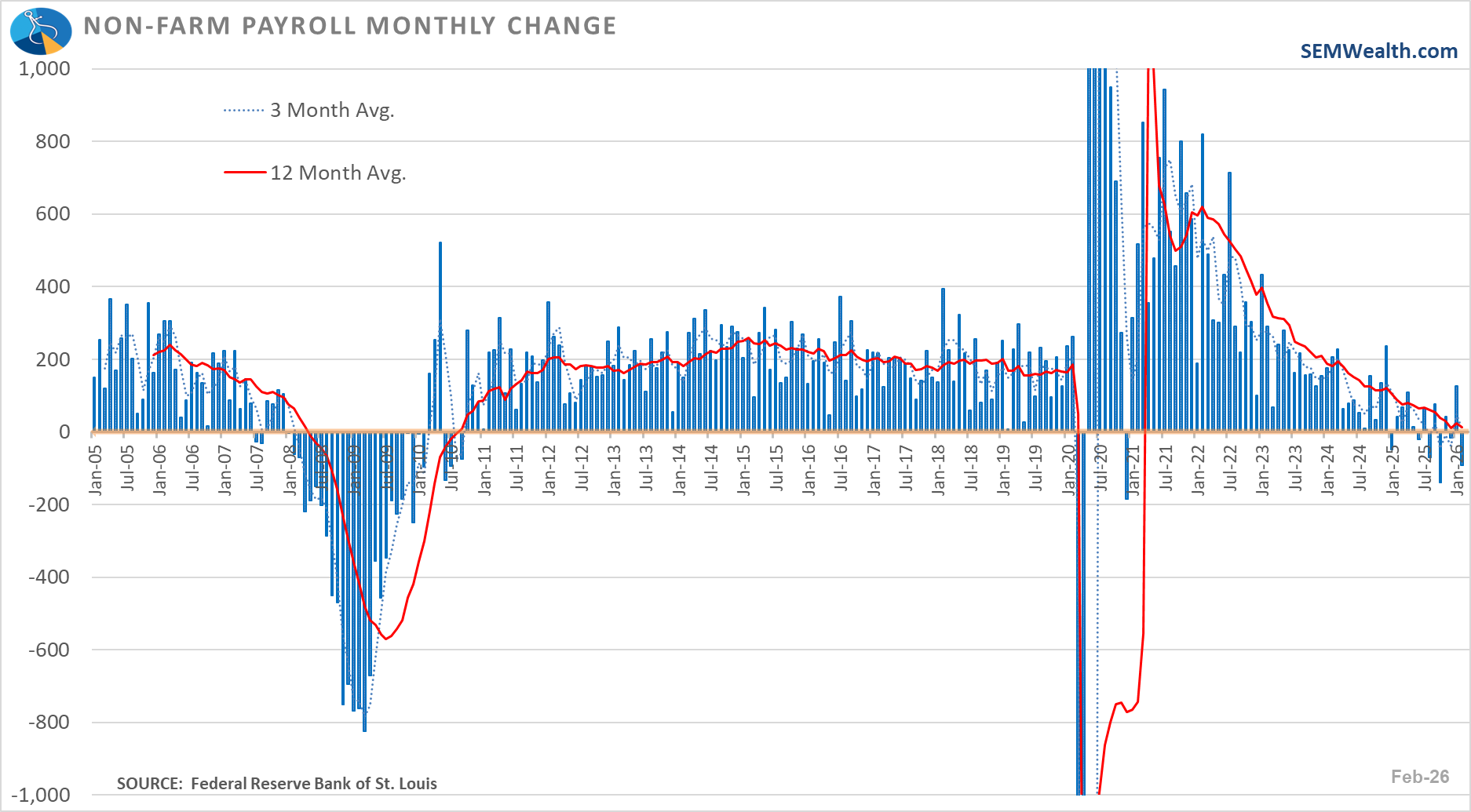Friday's payrolls report dashed the hopes the economy was stabilizing. Payrolls declined by 92,000 in February, bringing the 1-year change to +0.10%. This is the worse 12-months since the early days of the pandemic. Prior to that the last time payrolls were flat for the past year was in April 2008, just before the financial crisis reared its ugly head.