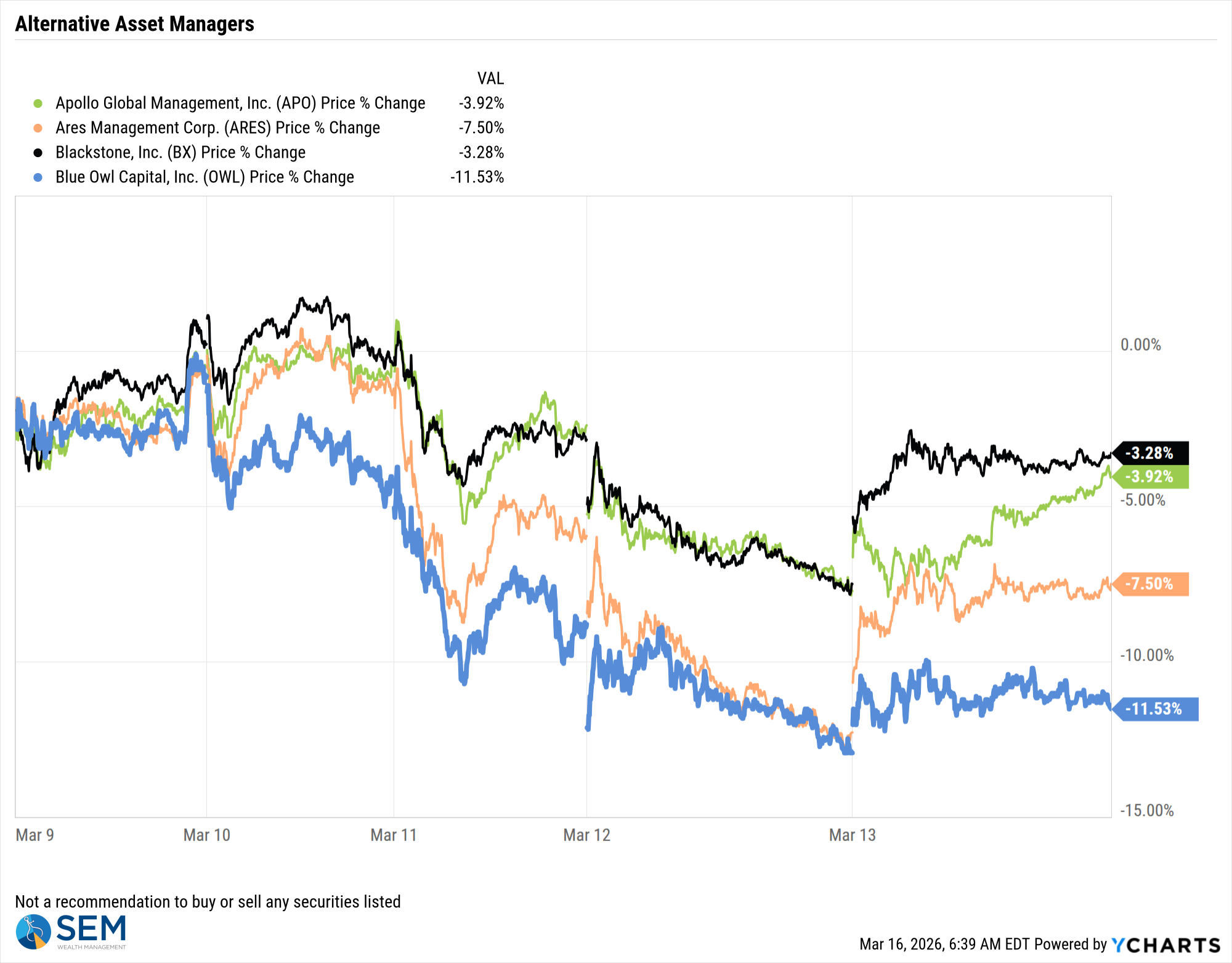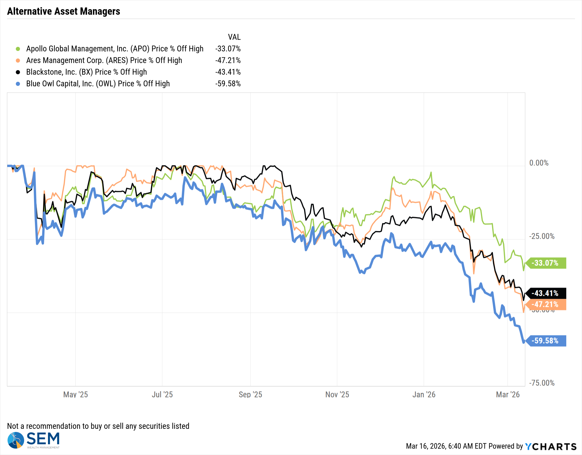 One of the things I've been waiting for was to see if the liquidity events we are seeing in the private credit world. I'm losing track on how many private credit funds could not meet the liquidation requests or how many loans are being written down. Since SEM does not invest in any of these illiquid vehicles I haven't dug into the details. I'll leave it to Wall Street to do that. Our best proxy of what they think is from the stock prices of the publicly traded asset managers.