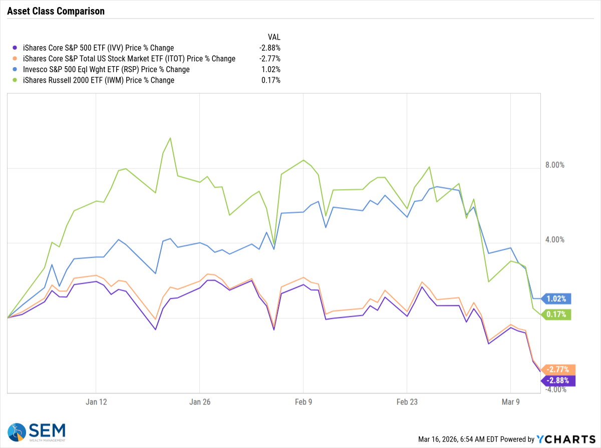 Small caps are still outperforming mega caps for the year, but they have taken a hit as the economic concerns start to build.
