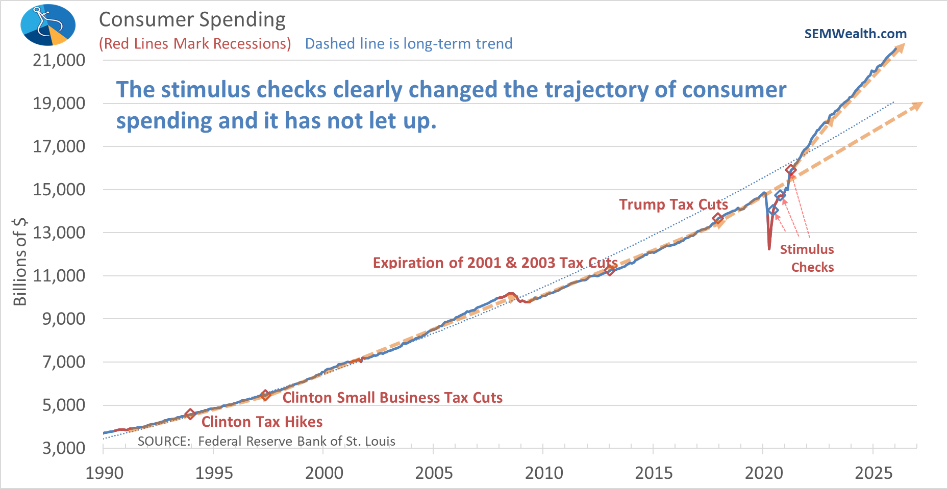 We also received updated consumer spending and personal income data for January. Consumer spending improved by 5% versus a year ago. As I've said for years now, the response to COVID broke our economy. The stimulus checks went to too many people who hadn't lost their income (retirees on social security and pensions and people who could work from their laptops). This excess money created a new uptrend in spending that we've yet to see broken.