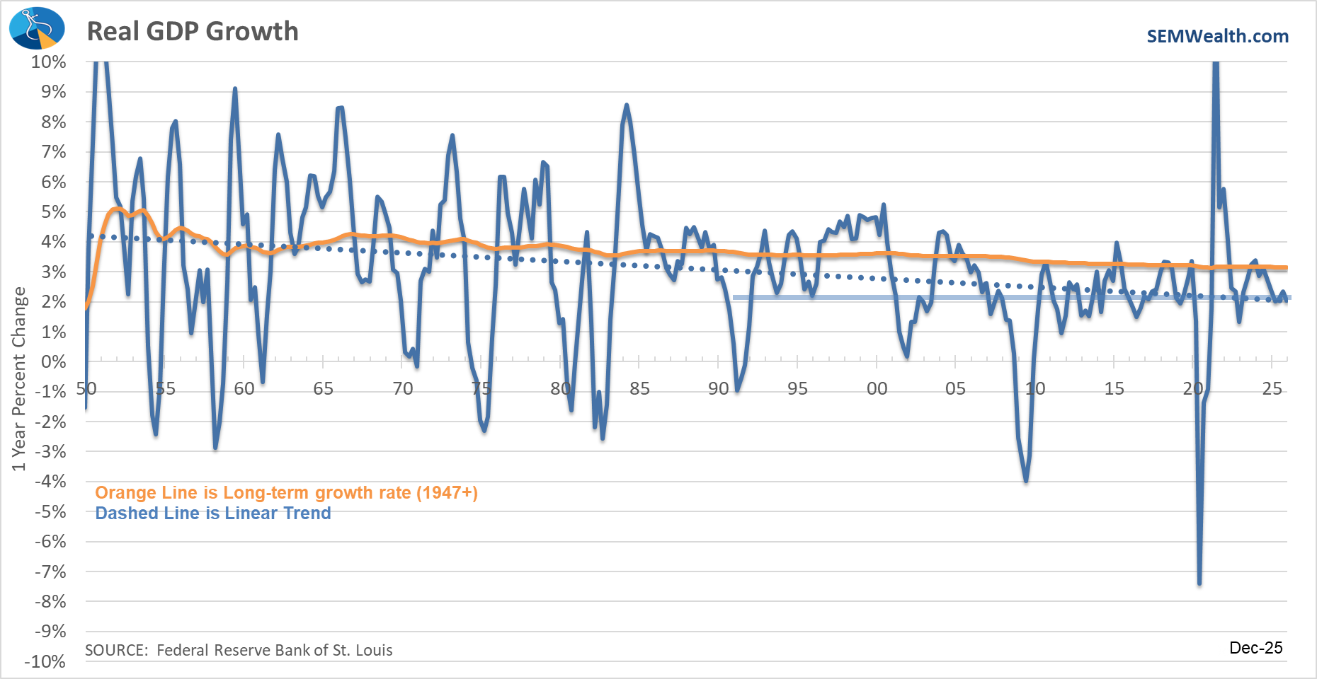 The final data update was a revision of the 4th Quarter GDP report, which showed a much weaker than expected end of the year. As I remind everyone – ignore the orange "official" bars which is what the headlines show and instead focus on the year-over-year change as that removes all seasonal adjustments from the equation. That number is showing what our economic model was signaling the last half of the year – an economy that is running well below "normal" (3%) at a decelerating rate.