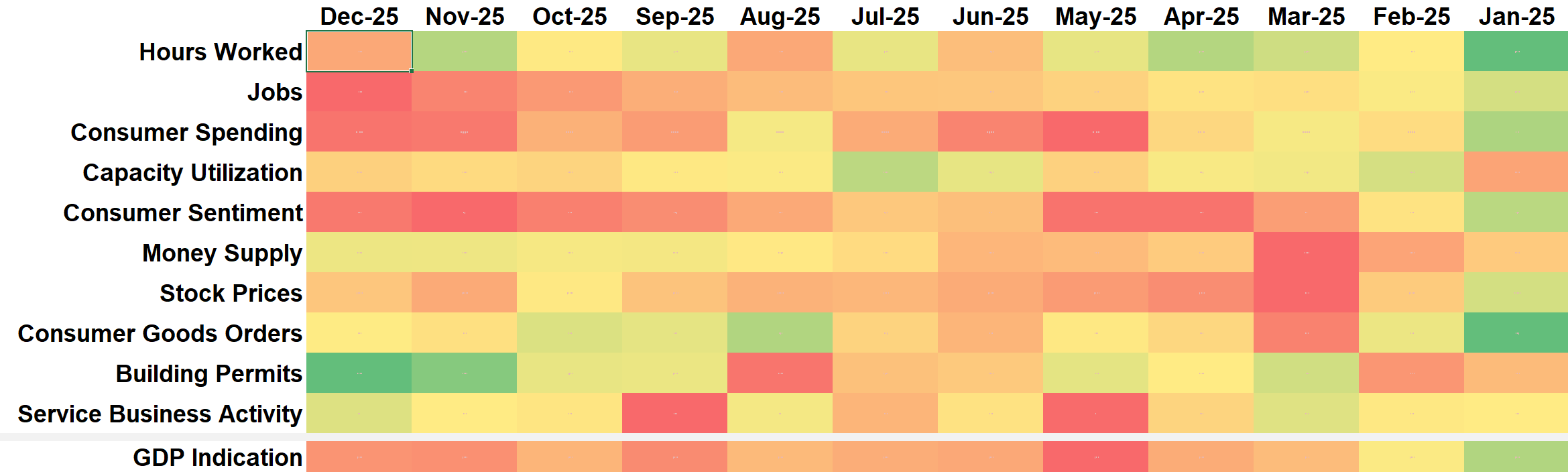 Our heatmap highlights the areas of strength and weakness. We already highlighted the troublesome labor market. The official consumer spending data we have has not been updated since September. We are currently using privately sourced data and trend models, which show a continued slowdown in spending. We are (again) supposed to get updated numbers through November early next week (although the government has been saying that since the 3rd week of December.)