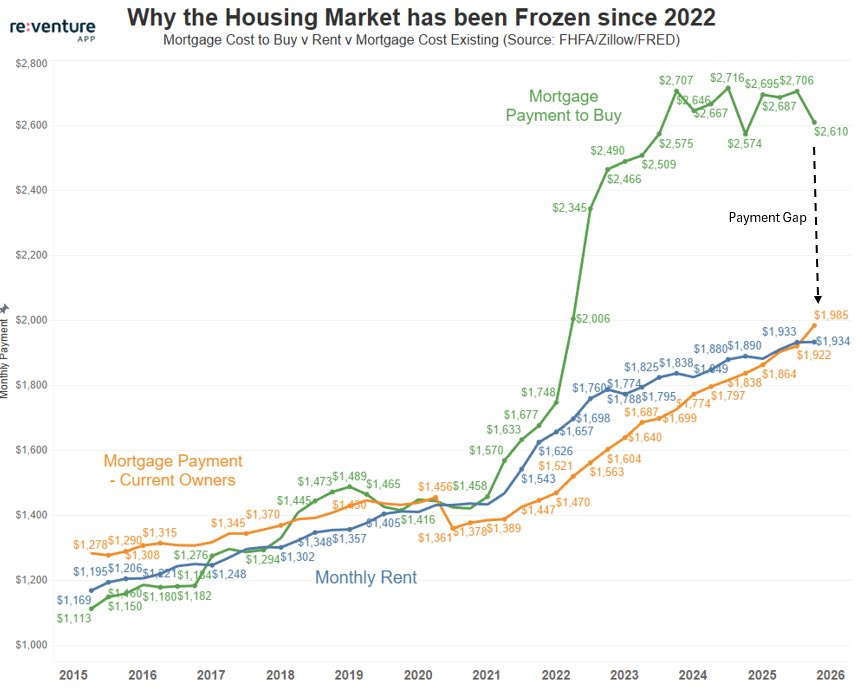 Mortgage rates fell below 6% on Friday (down about 0.22%). Based on past Federal Reserve purchases of this amount of mortgage backed securities, this is a large chunk of the expected 0.25-0.50% reduction in mortgage rates. Here's the problem – mortgage payments for NEW homebuyers became disconnected with rent payments and payments from EXISTING homeowners in 2022. This essentially locked out new homebuyers.
