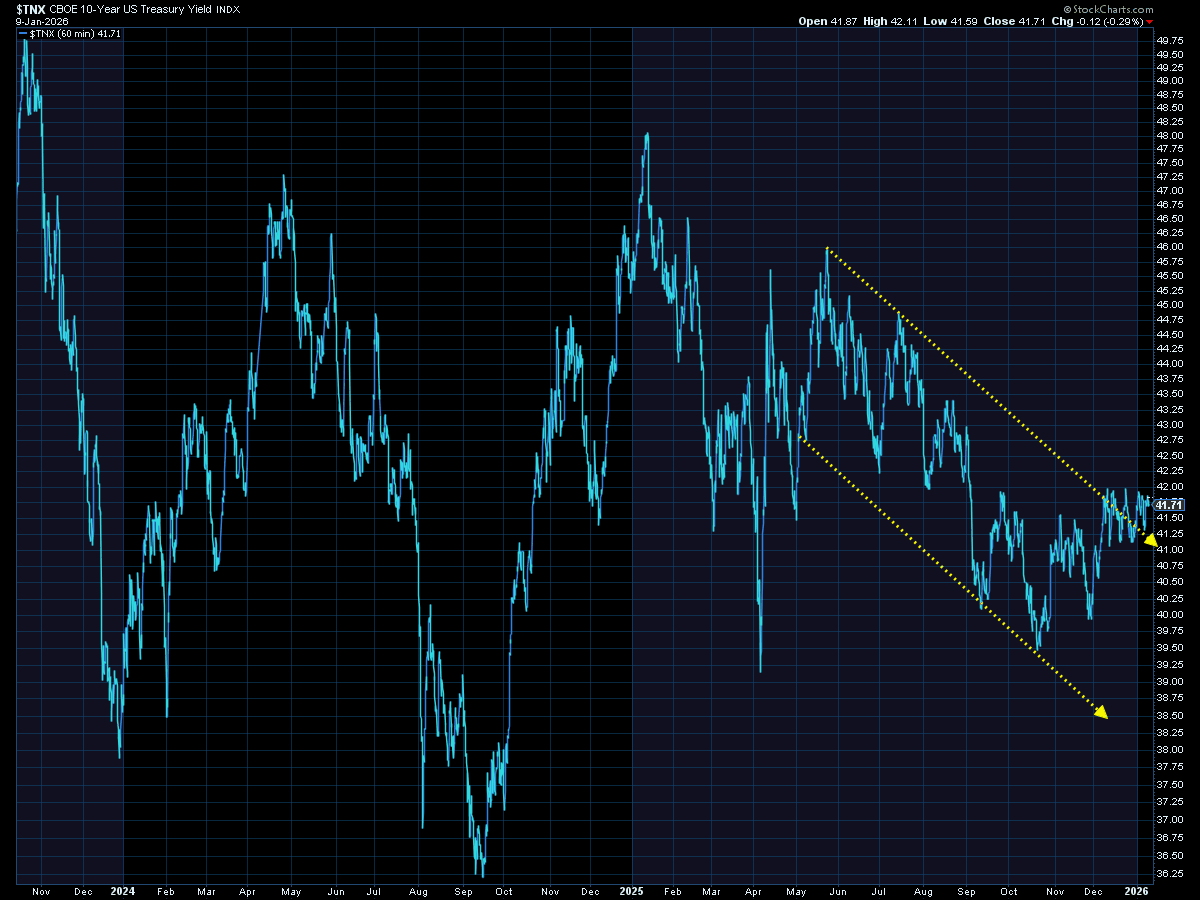 As we've been highlighting the past 5-6 weeks, the 10-year Treasury has broken its downtrend channel. It appears to be consolidating in the 4.1-4.2% range. Any move above that would be cause for alarm as it would indicate inflationary pressures, which will not only make the Fed's job harder, but also hit the lower half of the K.
