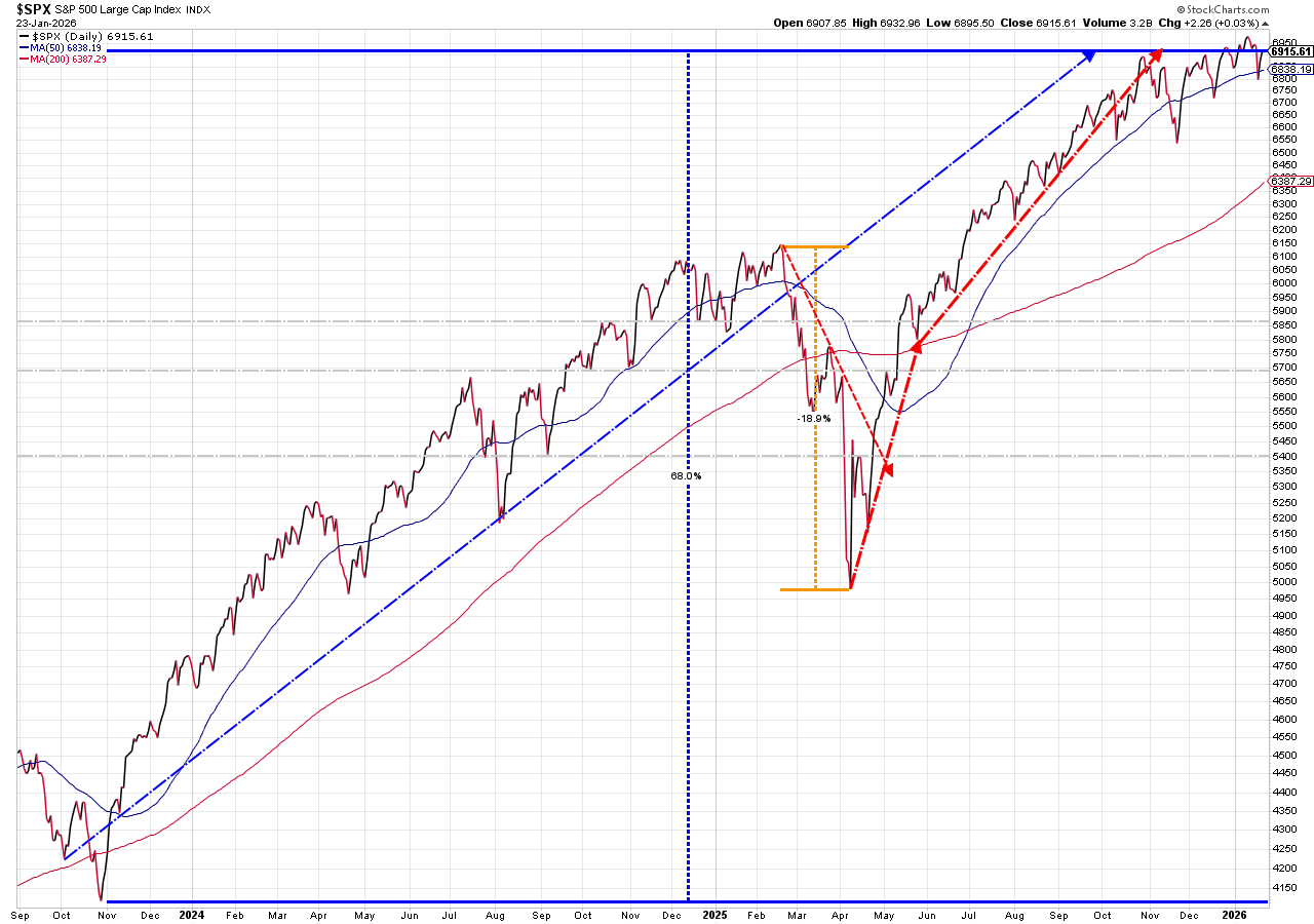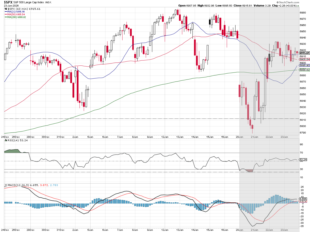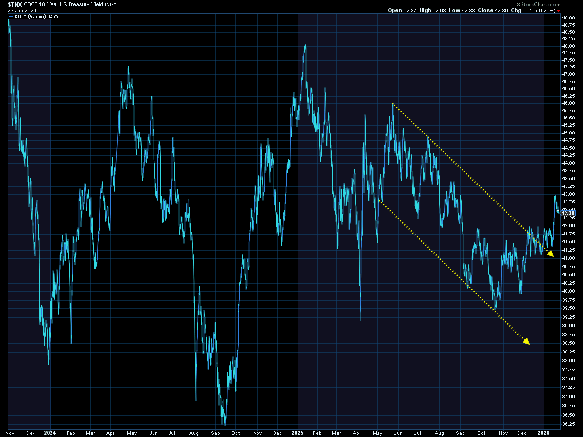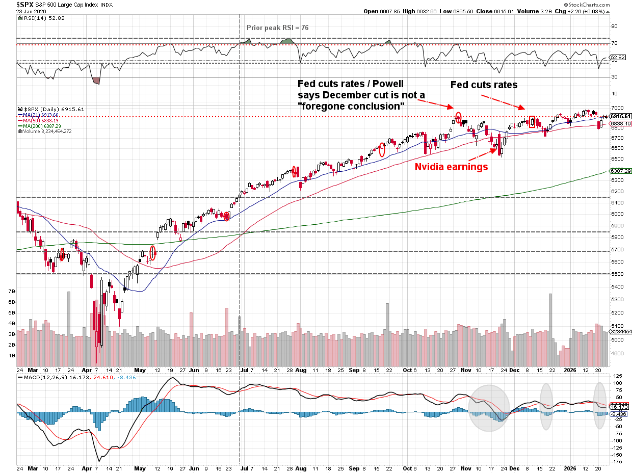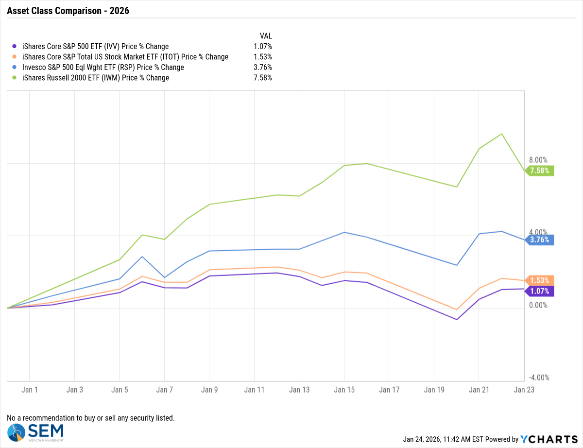 The S&P 500 posted back‑to‑back weekly losses, underscoring how fragile sentiment has become early in 2026. While it still outperformed for the week, even the small cap Russell 2000 gave back a little of its early year gains. The S&P 500 started the holiday-shortened week down with President Trump again fixated on taking Greenland. He quickly reversed course on Wednesday, first taking the threat of force off the table and then after the market closed announcing the "framework of a deal" that most importantly ended the threatened tariffs against NATO countries who didn't support his quest for Greenland. The rally was short-lived with the remaining two days seeing strength as an opportunity to sell. (This roller-coaster dominated "Toby's Take" this week – make sure you check out his brief summaries below.)