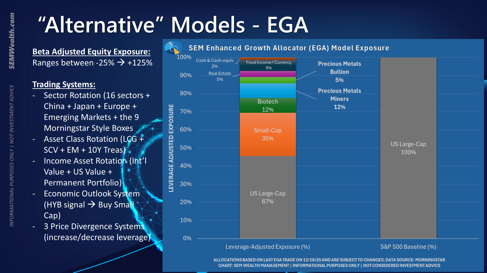 I discussed the two options we have at SEM last week (Enhanced Growth Allocator [EGA] and Dynamic Asset Allocator [DAA]). These models are completely different from each other and play different roles in the overall plan. They are highly complex, but both offer ways to gain MANAGED access to Precious Metals. Currently, EGA has a 17% position and DAA is at 25%.