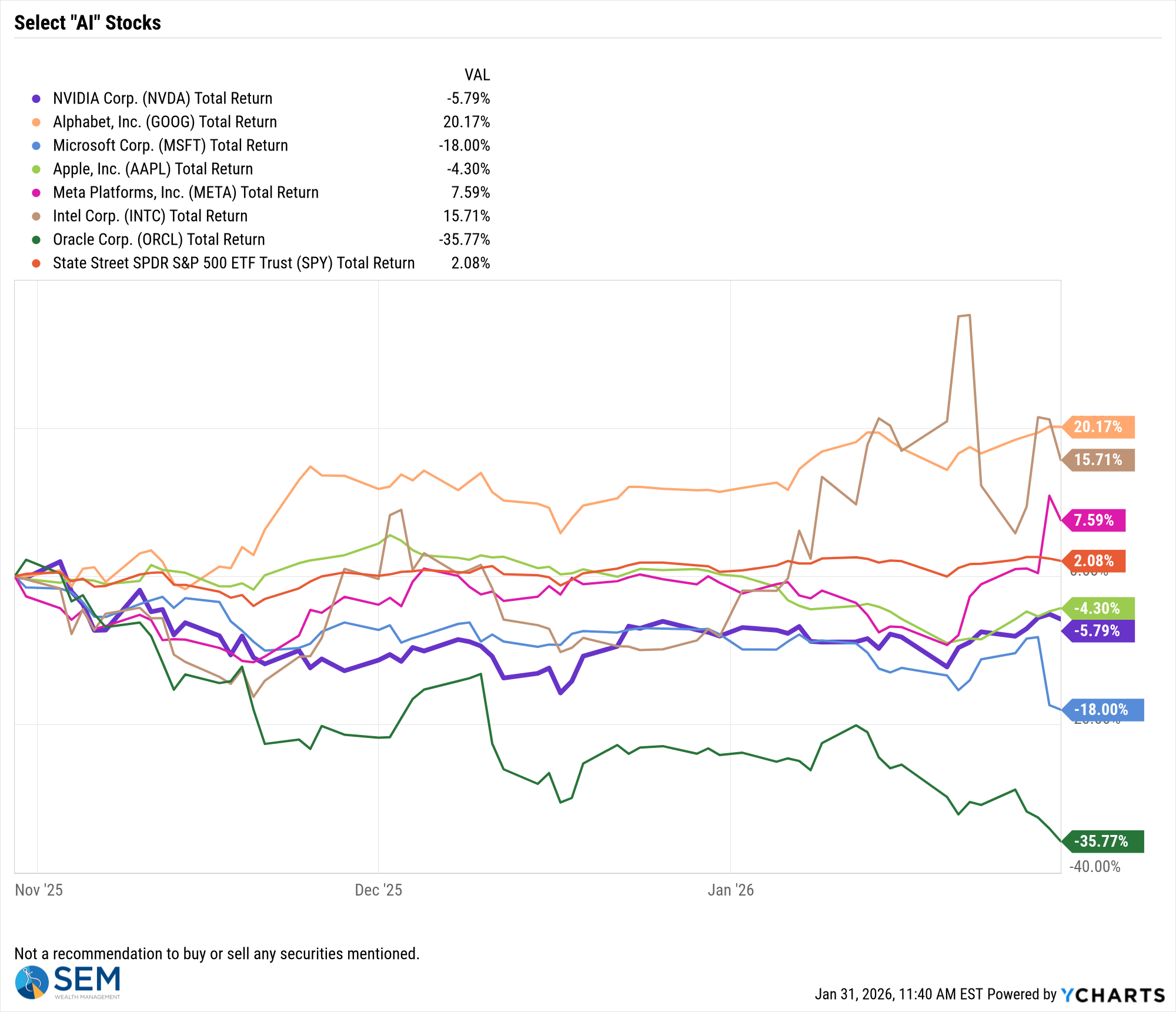 Over the past 3 months, the S&P 500 is up 2%. The performance of the big name "AI" stocks has been all over the map.