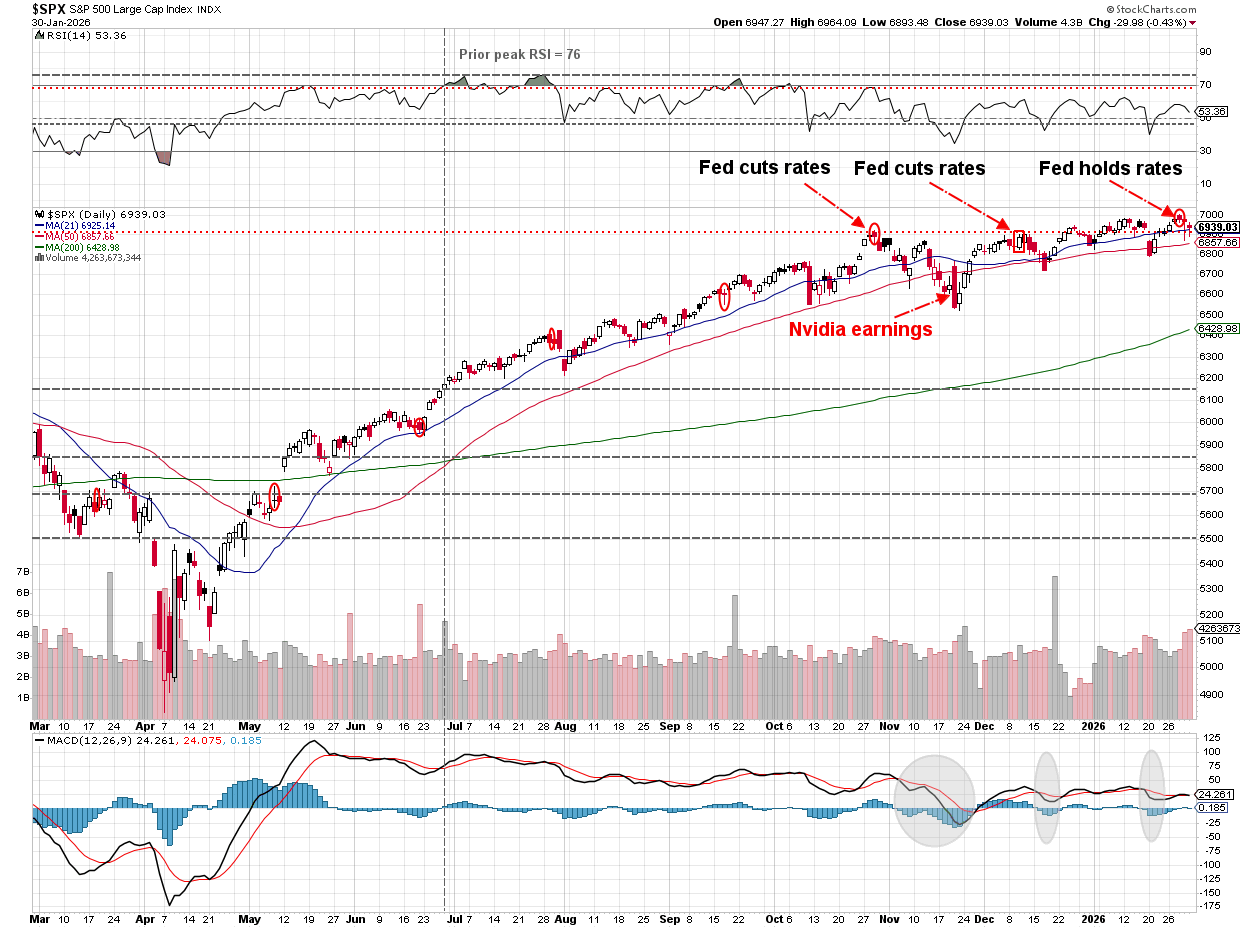 As the East Coast spent the week chipping away at layers of ice, markets were digging themselves out from a freeze of their own — a hard freeze of expectations. Big tech earnings, a no‑surprise Fed decision, and a new Fed chair nominee all hit at once, cracking the surface of what had looked like a steady start to earnings season. What followed was a melt‑and‑refreeze cycle across assets: precious metals spiked then shattered, mega caps swung sharply, and investors tried to find stable footing on increasingly slippery ground.