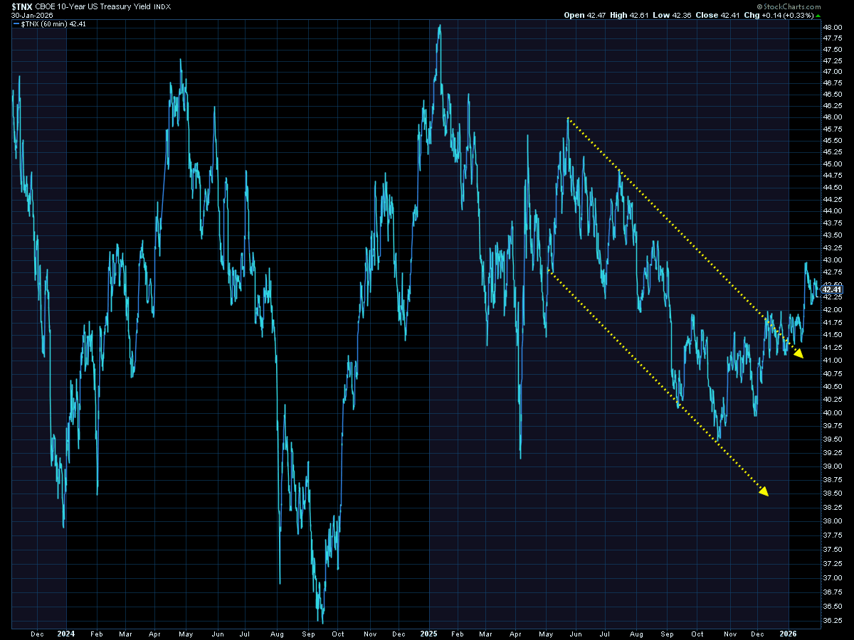 Yields on the 10-year bond were up again last week and continue to consolidate after breaking the 6-month downtrend channel in late 2025.