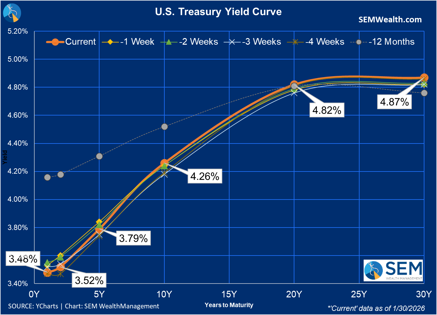 Looking at the yield curve, the assessment from the bond market last week seems to be the Fed meeting and the President's choice of Kevin Warsh (for now) seems to be "lower short-term rates, higher long-term rates" as the yield curve again steepened a bit last week.