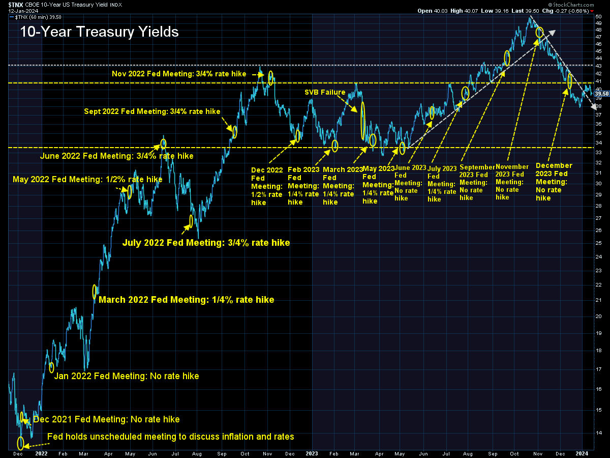Turning to bonds, the 10-year Treasury yield had a volatile week, crossing back above 4% earlier in the week before settling just below that benchmark. Remember, the market is pricing in roughly 6 interest rate cuts in 2024 while the Fed is predicting just 3. While that disconnect is sorted out we could see continued volatility in the rates market.