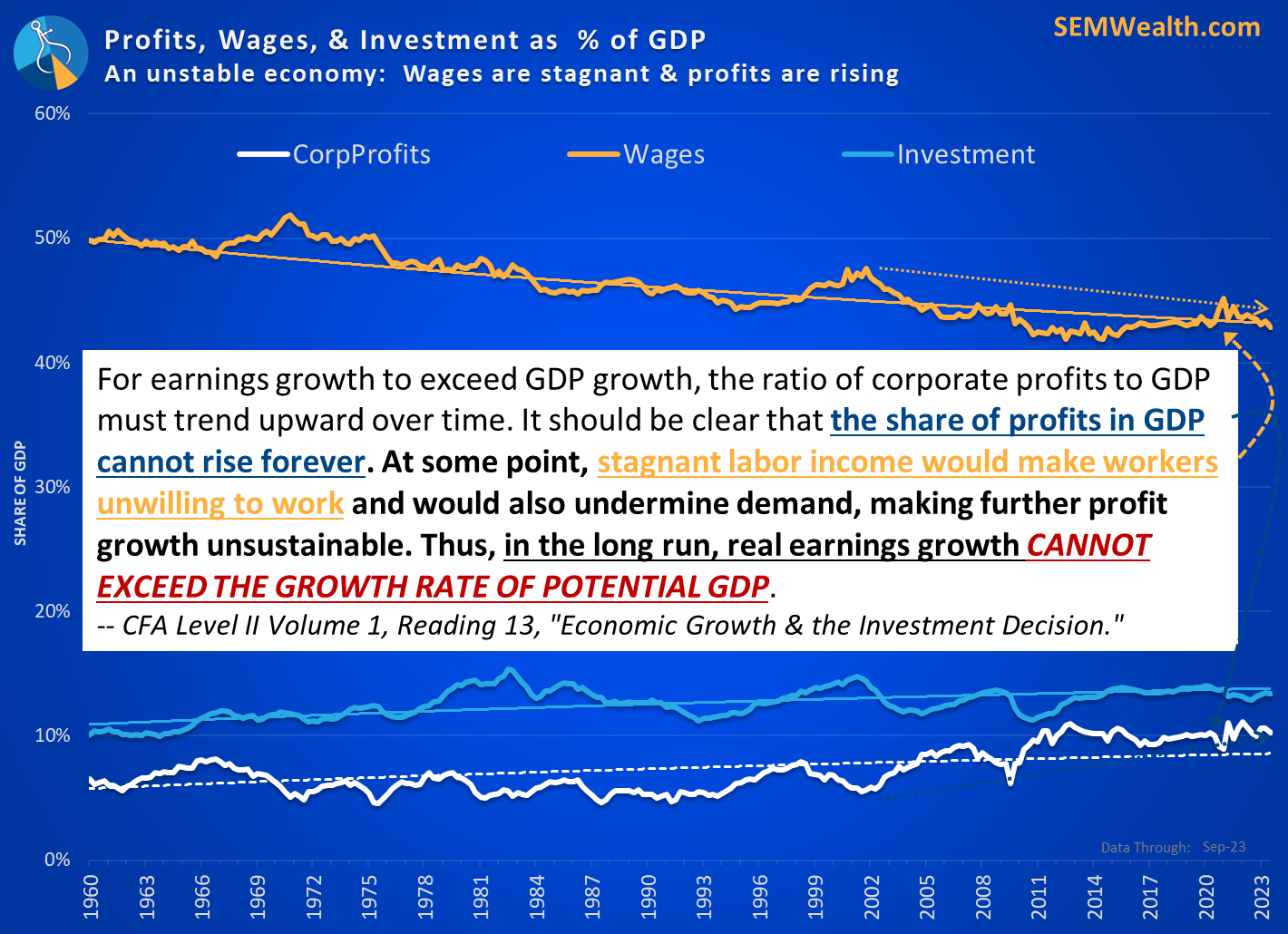This is based on long-standing economic theory. In fact, I shared this chart back in 2015 which included a quote from the CFA Institute discussing the economic problem if labor (employee) share of profits is stagnant. Notice the trend in wages versus the trend in profits. In other posts I've talked about how our economy has been growing below potential.