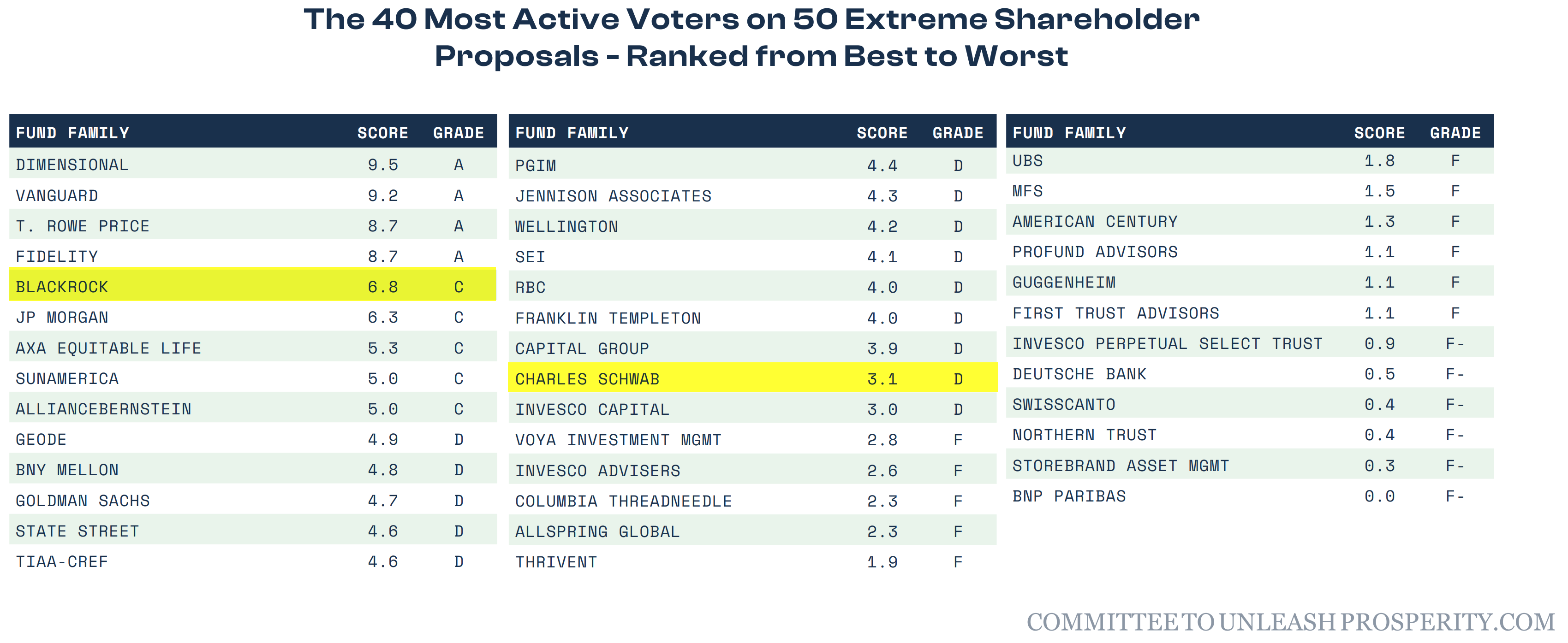 I recently was forwarded this report and it was FASCINATING because it was an INDEPENDENT look at the voting records of fund managers in terms of how often they support ESG friendly policies. An A means they vote for very few ESG policies and an F means they support all of them.