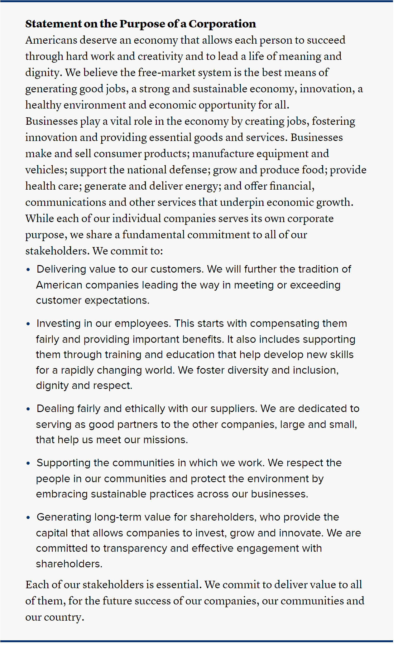 What Mr. Fink and the Business Roundtable said in 2019 was essentially, we need to get back to the pre-1995 definition of the role of a corporation. Going back to Mr. Fink's original comment: