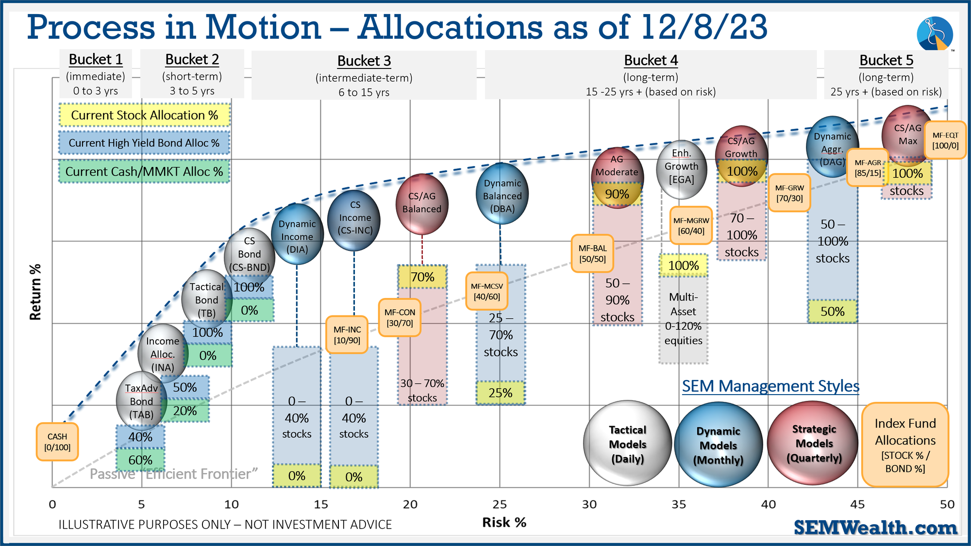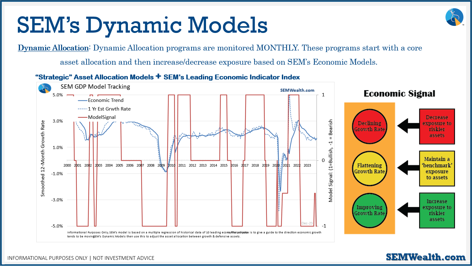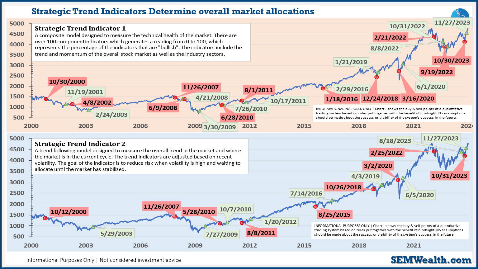 The * in quarterly is for the trend models. These models are watched daily but they trade infrequently based on readings of where each believe we are in the cycle. The trend systems can be susceptible to "whipsaws" as we saw with the recent sell and buy signals at the end of October and November. The goal of the systems is to miss major downturns in the market. Risks are high when the market has been stampeding higher as it has for most of 2023. This means sometimes selling too soon. As we saw with the recent trade, the systems can quickly reverse if they are wrong.