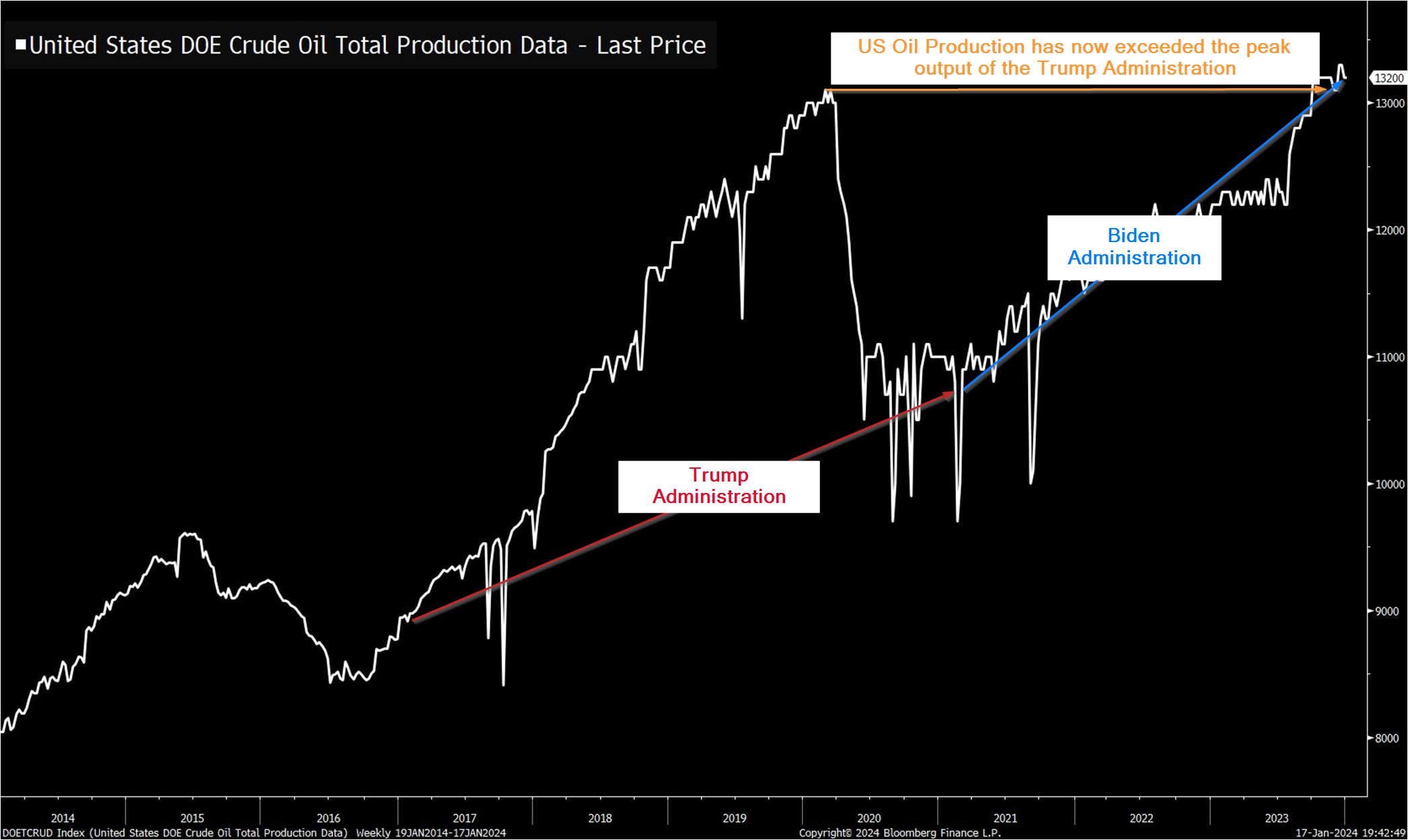 I don't think anybody would have predicted back in 2021 that the Biden Administration would supervise a record high in US oil production, exceeding the pre-COVID peak of the Trump Administration. Data has a funny way of contradicting political narratives as we discussed last week: