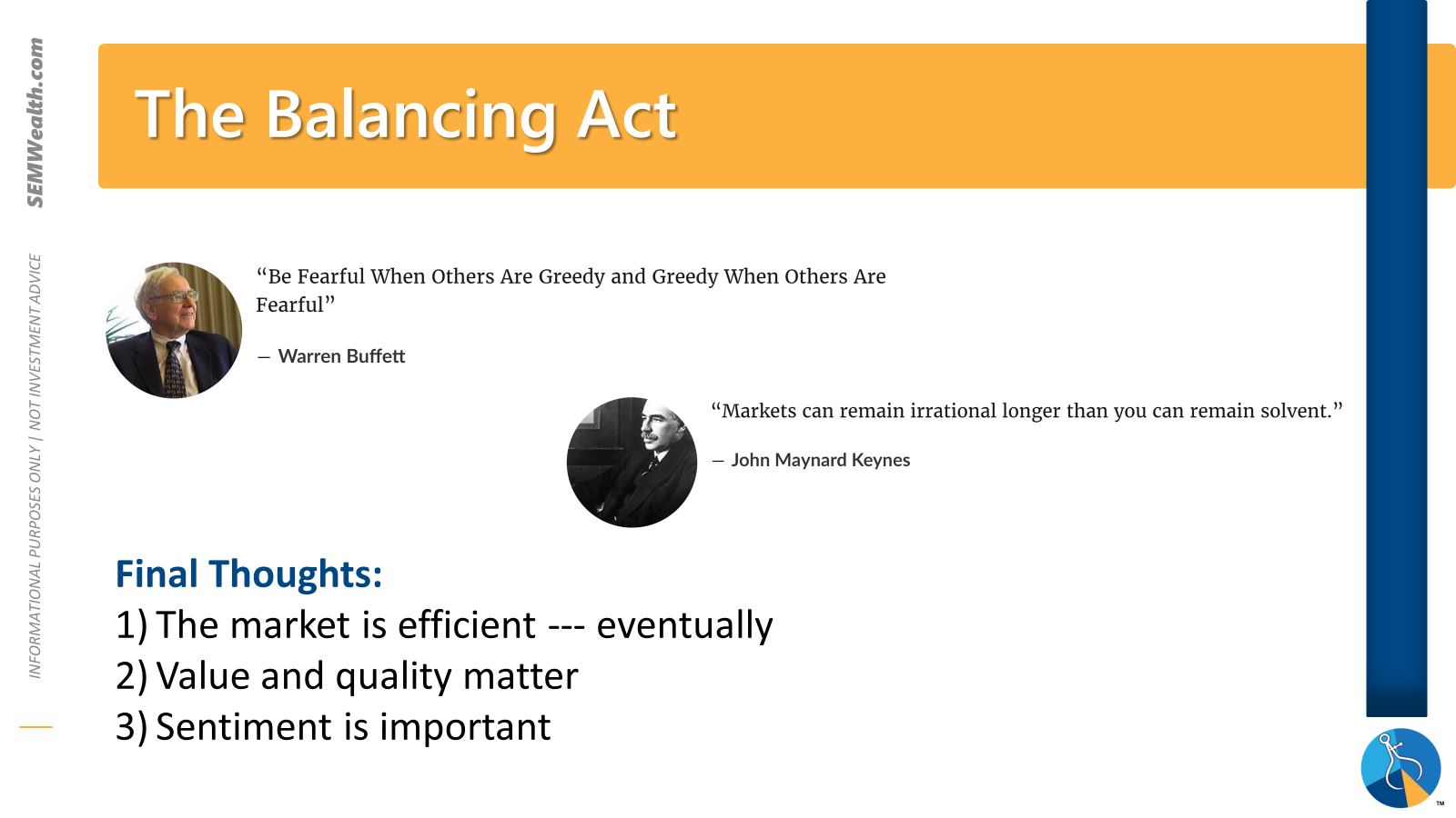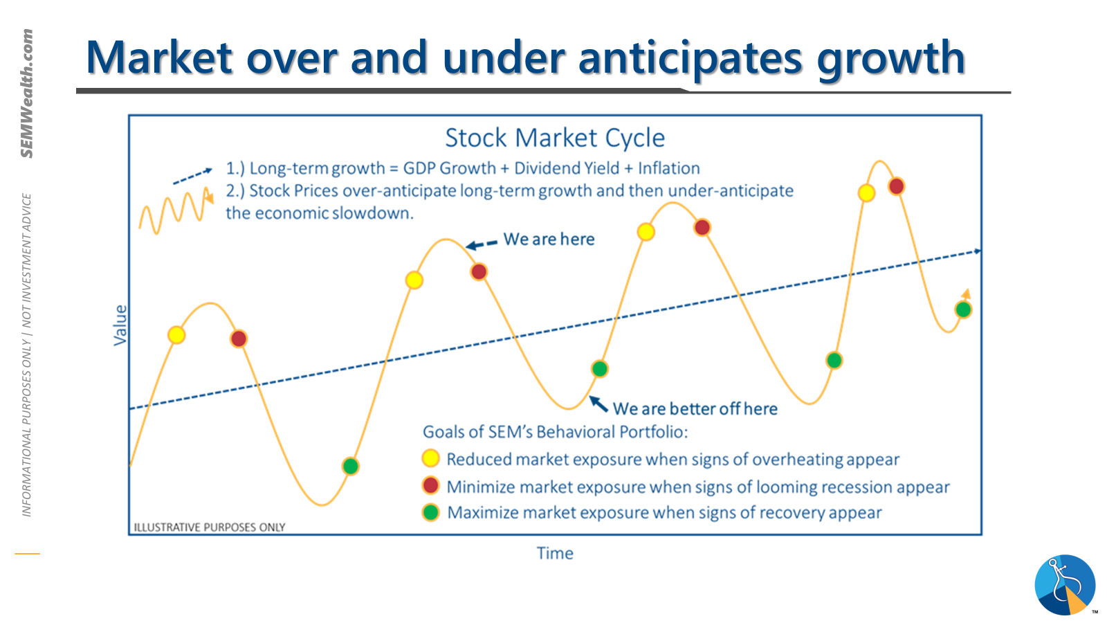 One of the key principles I discussed was market efficiency – does the market fully reflect all known information. My experience and research says eventually it does – great companies add significant value to their shareholders and bad companies take away value, but over the short-term the market is nowhere close to efficient. Human emotions take over and cause cycles of optimism and pessimism which cause big swings in market valuations.