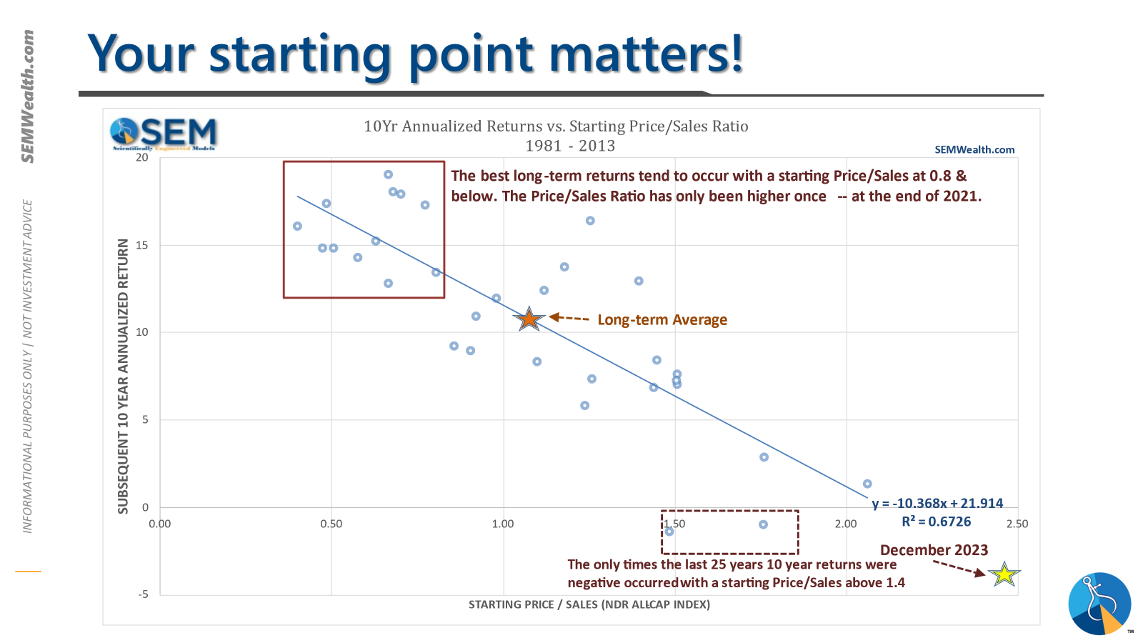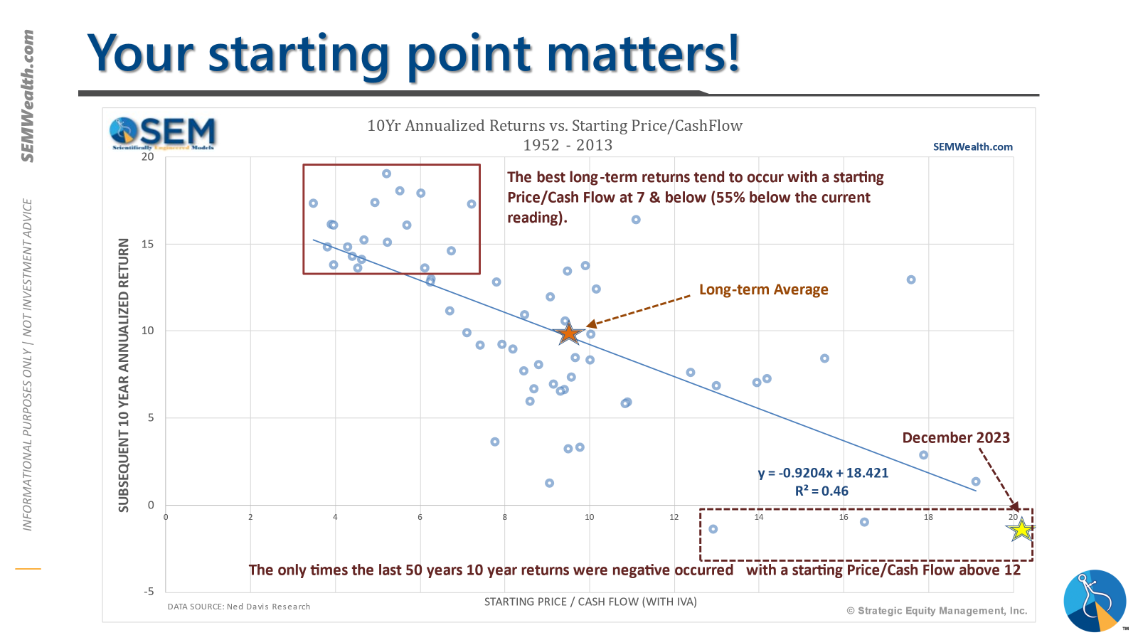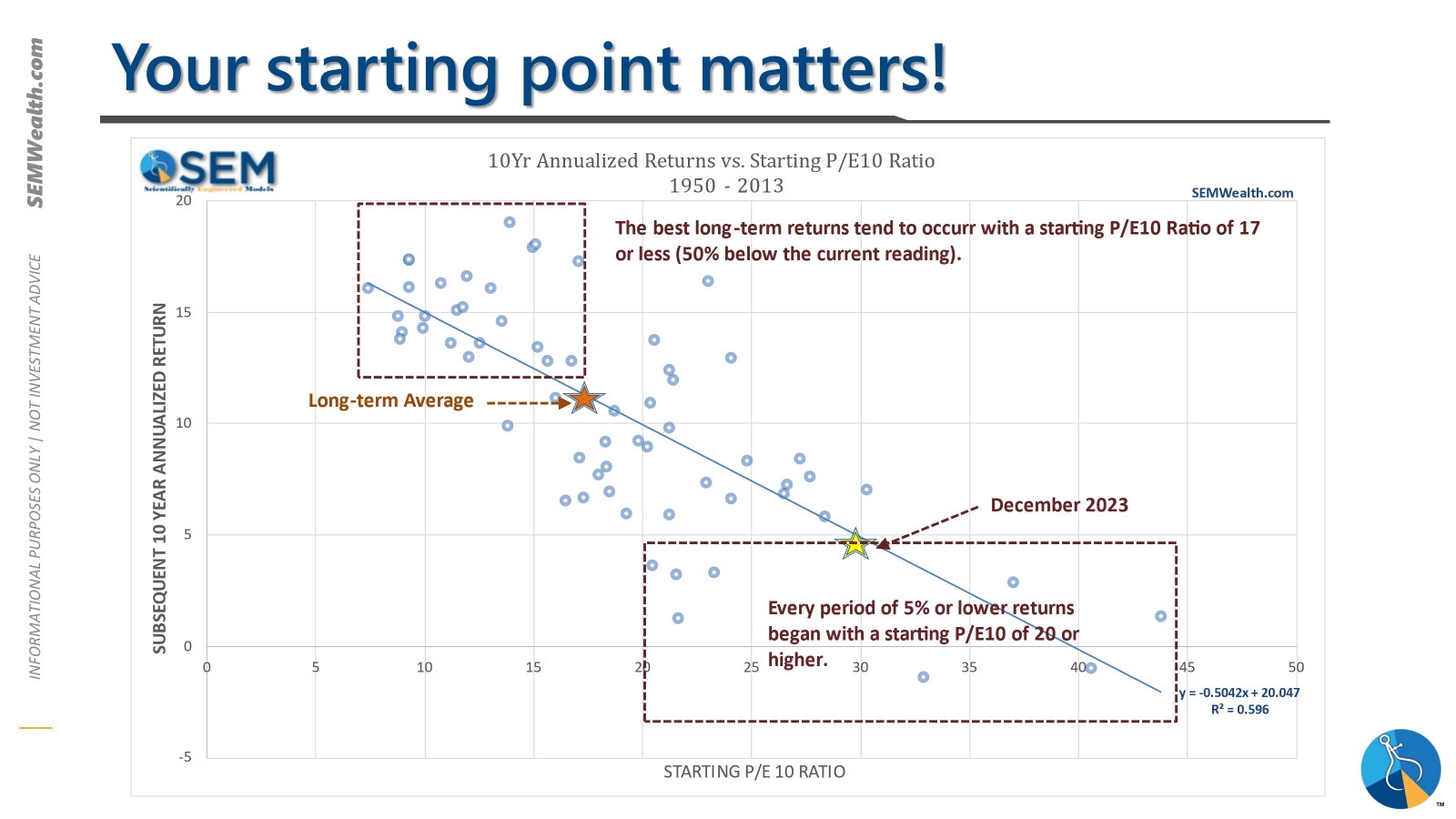 To summarize – the best long-term returns come when the stock market is undervalued. After long periods of time where the market has enjoyed above average returns we see a quick, sharp reversion to the mean. A small change in the perceived long-term growth rate or a small increase in interest rates could lead to a huge (25-48%) drop in stocks.
