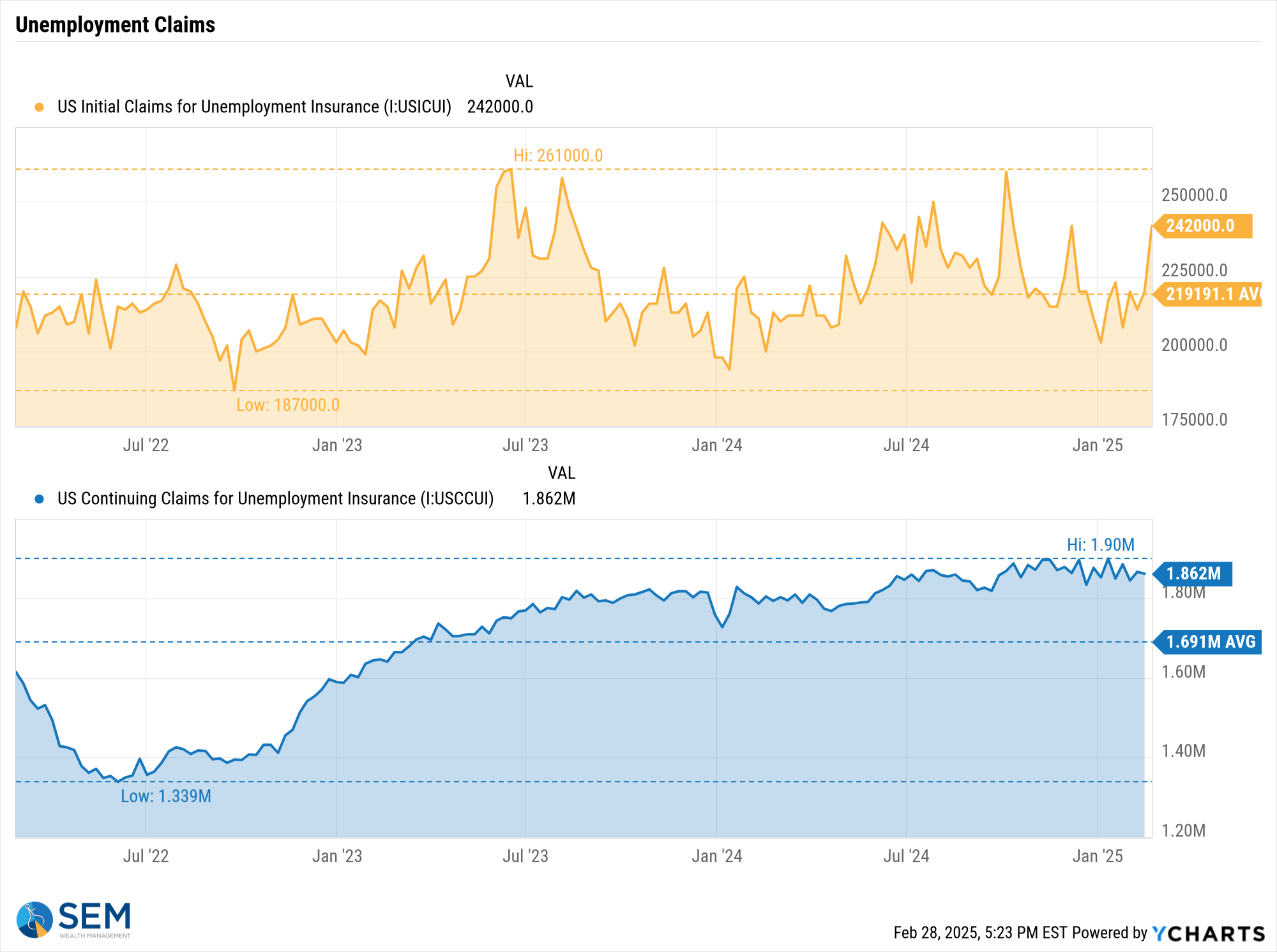 Last Monday near the end of the blog I mentioned a slightly increasing concern about stagflation – rising inflation combined with falling economic growth. Last week the economic data was not as negative as the prior week, but it still wasn't great. First off, consumer spending fell on a month-to-month basis in January for just the 4th time since 2022. Consumers have been the one thing holding up the economy the last 5 years.