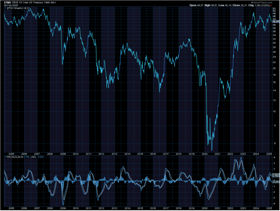 Speaking of consolidation, the longer-term weekly chart of Treasury Yields look to be in a consolidation period going all the way back to mid-2023. While the recent anxiety out of DC has caused yields to drop quickly the last few weeks, the prior trend was up, so the most likely resumption would be for yields to move higher once this phase is over.
