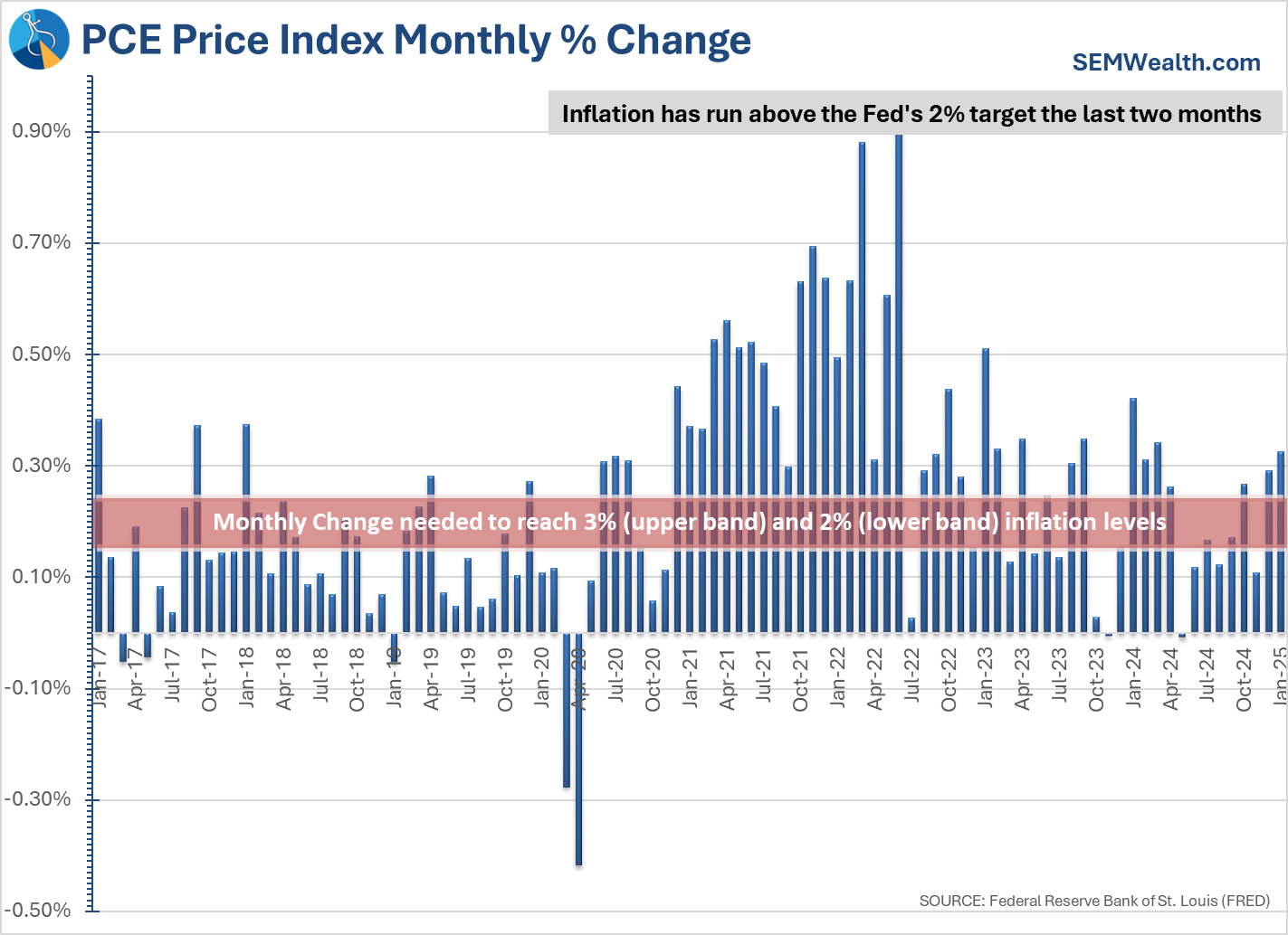 I like to use this chart to look at the month-to-month changes in inflation and how it relates to the Fed's 2% target as well as the 3% level which I believe is more likely going to be our new long-term average. For the 2nd month in a row, inflation is not only above the 2% level, but running above 3%.
