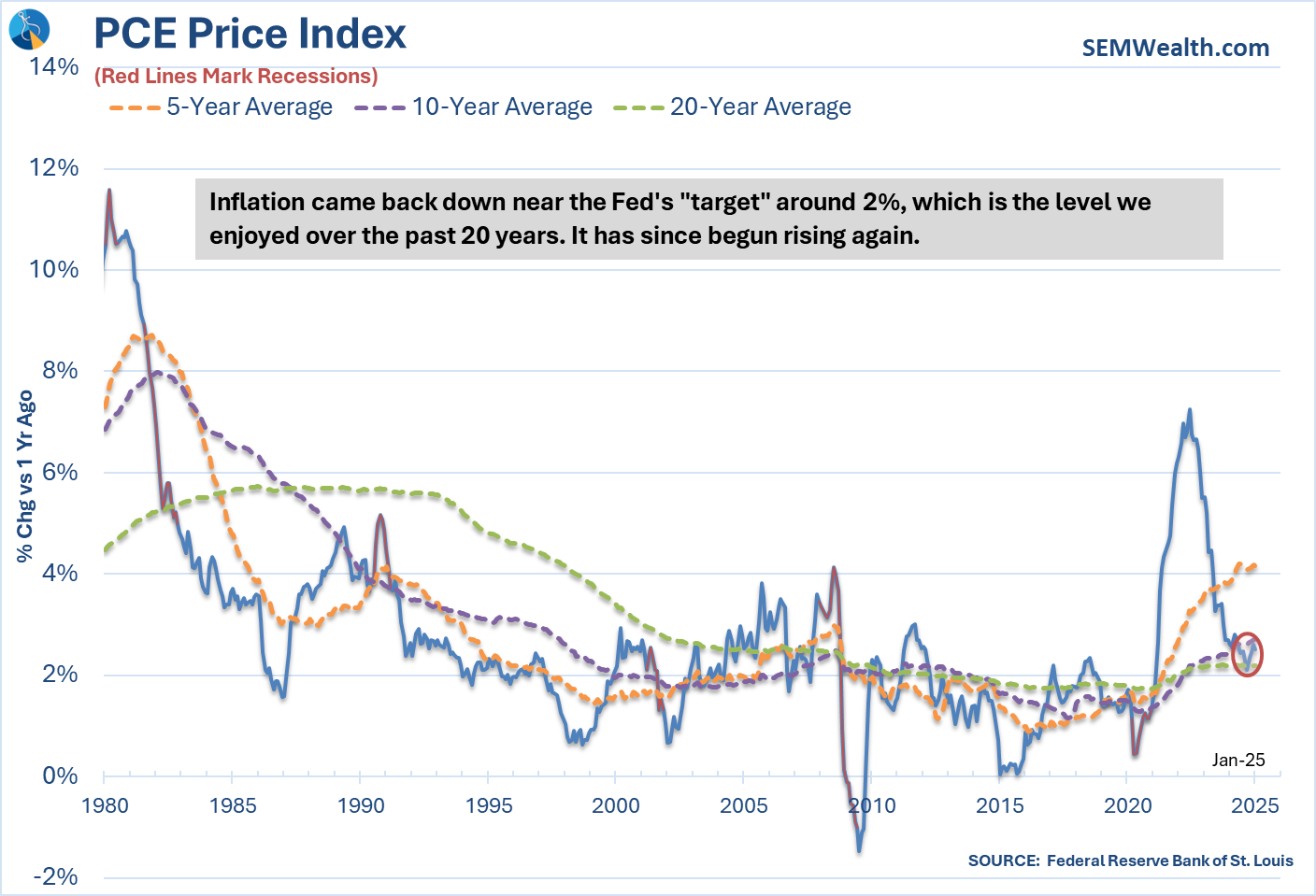 I like to use this chart to keep things in perspective as it shows the various AVERAGE inflation levels over time. Note the blue line (1-year inflation) has been rising since the Fed started cutting rates in the 2nd half of 2024 (coincidence? I think not).