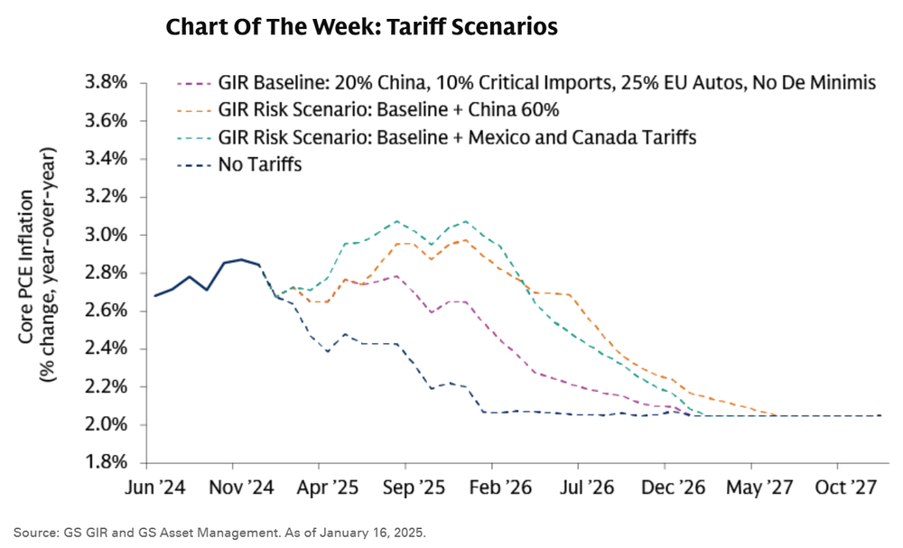 This is obviously front and center and something we have talked about since the beginning of the year. Late last week stocks moved to the lowest levels since Inauguration Day when the President announced the "delayed" 25% tariffs on Canada and Mexico would begin this Thursday. He also announced an "additional" 10% tariff on all Chinese goods. I posted this chart from Goldman Sachs a few weeks ago with their assessment on how much inflation would increase under a few different scenarios. Right now it looks like we are looking at either the aqua or orange colored lines: