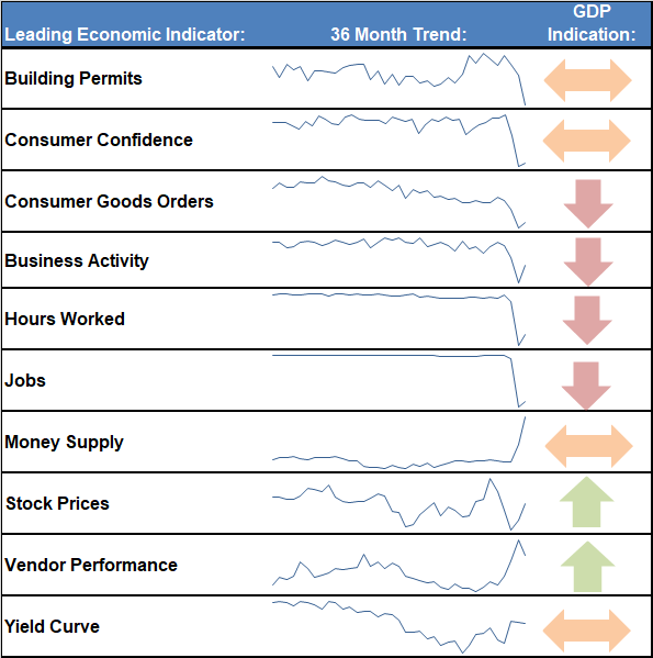 I mentioned last week our economic model picking-up on some improvement in the indicators, namely in the Money Supply (obviously thanks to the Fed & Congress), Yield Curve, Manufacturing New Orders, Service Business Activity, and Stock Prices (which is a leading economic indicator). This movement was enough for our Dynamic Income Allocation model to cut its Treasury Bond duration in half at the end of May. The timing was pretty good. We saw the 10-year Treasury bond go from 0.6% to 0.9% last week. Despite that, there is a long way to go. Here's our updated indicator dashboard from our economic model.