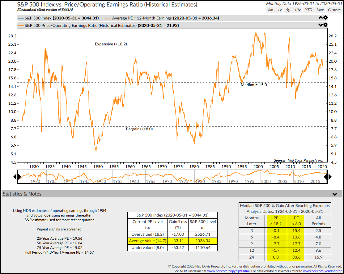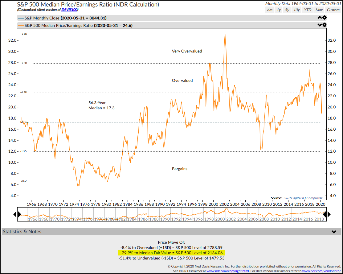 The first looks at the Median P/E, which provides a more balanced look at the overall market by removing the outliers from the average. As of the end of May stocks were 30% overvalued and 51% from being "undervalued".