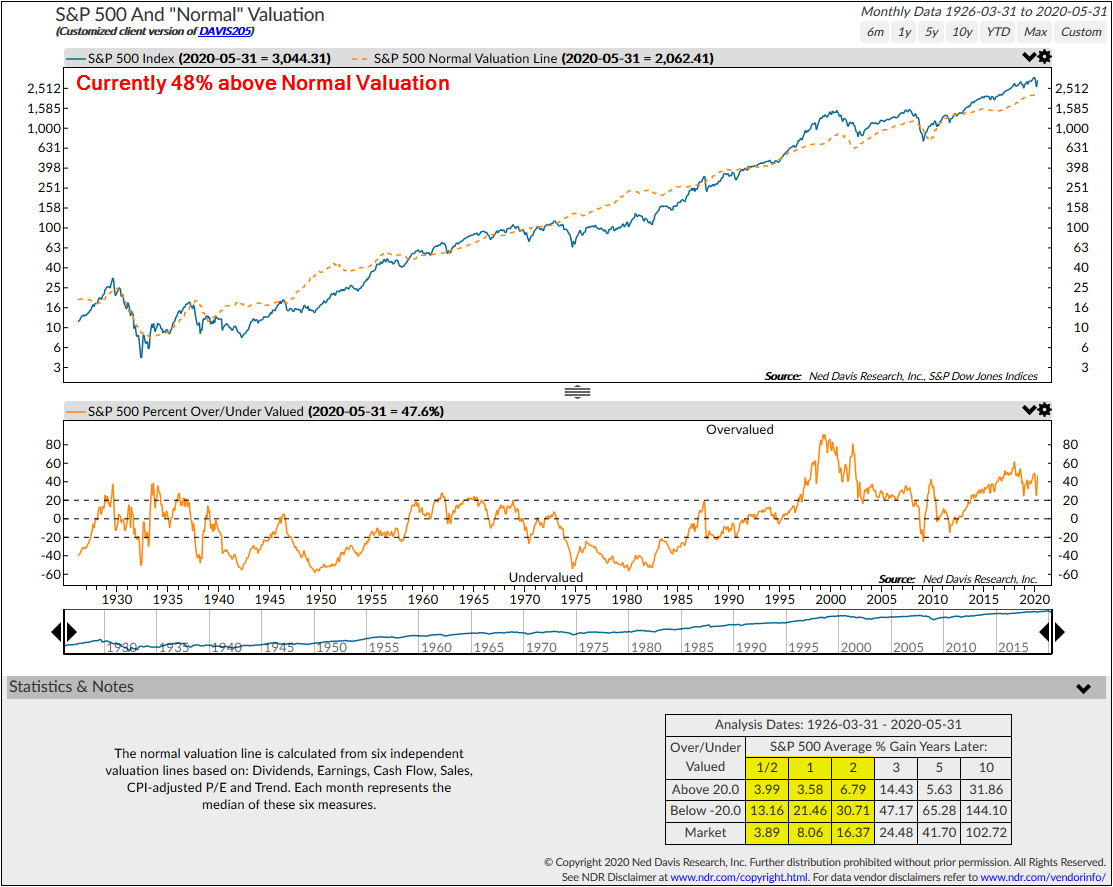 The final chart is really interesting. NDR looked at six different valuation indicators to plot a "normal" valuation. This gives a much smoother trend and removes the fluctuations we see from different cycles. It also provides an upward bias to valuations, which I've heard analysts argues is necessary due to the 40-year downtrend in interest rates and the impact technology has had in increasing profit margins. Even using this more favorable metric, stocks are still significantly overvalued.