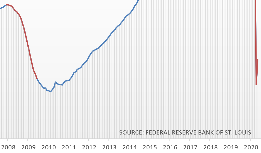 I think this chart tells a better story. Based on the May number we have 87% of the jobs we had in February.