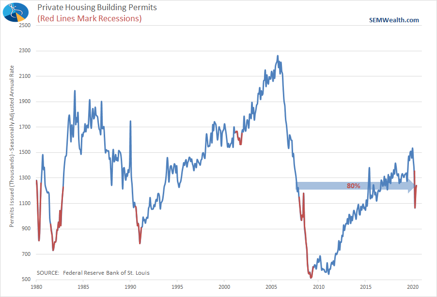 Last week we received a few more economic data points. Housing will be an interesting segment to watch. With more firms allowing permanent work-from-home arrangements, we could see more people moving further from the city centers. I've always watched Housing Starts and Building Permits closely as the amount of economic activity surrounding the building and purchase of a new home is significant. It also shows confidence in the economy. Last week we received the June housing numbers. Permits have grown to the point they are only 2% below where they were at a year ago. The problem is the level we are at is still just 80% of the January peak.