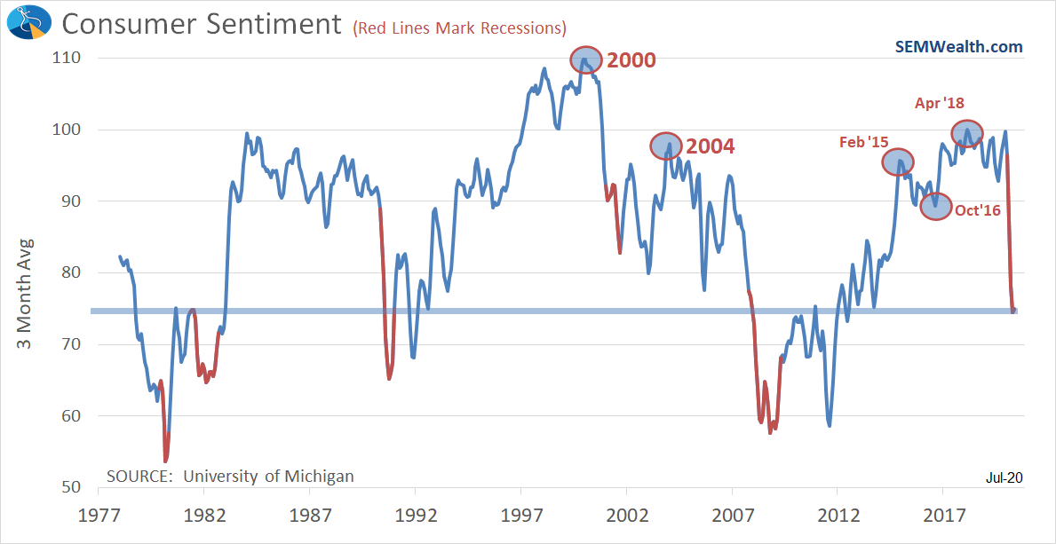We also saw the preliminary reading on Consumer Sentiment for July. This number was a big disappointment for any of us hoping the economy is going to be roaring back by the fall.