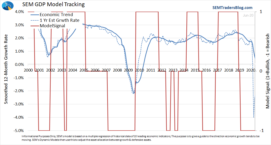 Our economic model remains "bearish" as it has been since February 2019. Remember, the economy everyone is longing for was already week when we started the year. The impact of the tax cuts had already worn off. Profit margins and revenues were declining. Leverage in both household and business sectors was above pre-2008 levels. Our model is designed to adjust around all the noise and pick-up on trends. So far, the bounce is nothing to be excited about.
