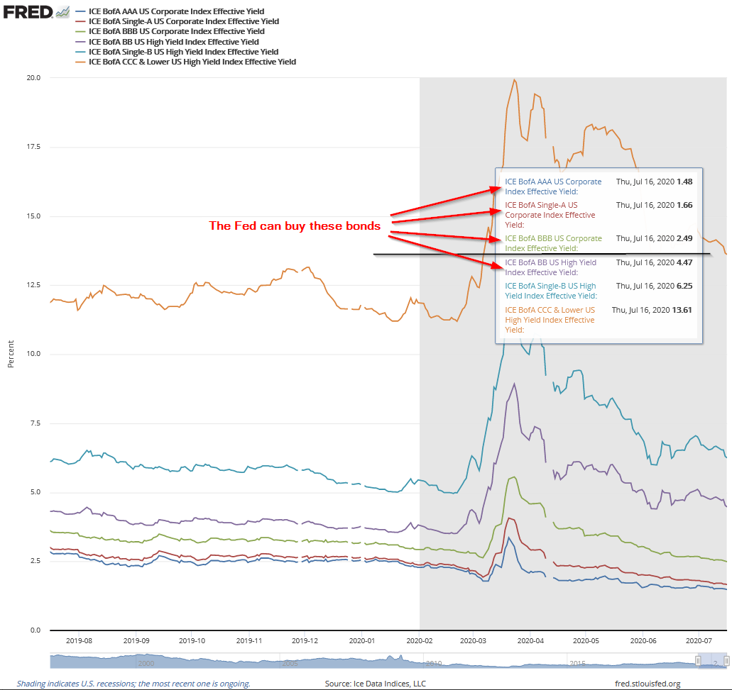 One of the key things the Fed has done is create a perceived safety net for the corporate bond market. We were quite excited about the opportunities in high yield bonds. As the spread between high yield issues and Treasury Bonds increase, we have tremendous opportunities to sweep into high yields at bargain prices. Unfortunately, the Fed has delayed the huge opportunities.