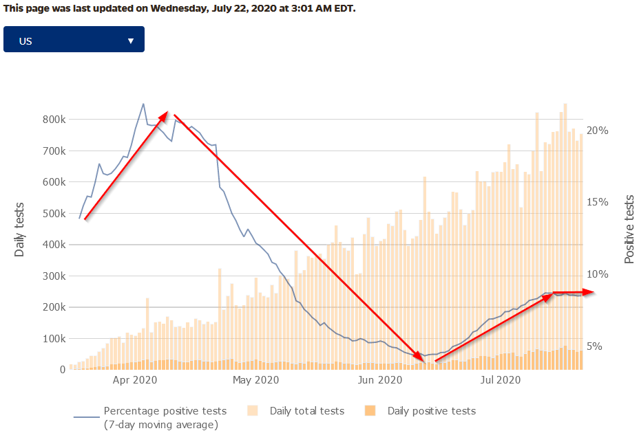 "Record case numbers" are the headlines, but I choose to focus on the percentage of positive cases. This gives us a more clear picture of the spread of the virus in a community as well as the overall trends. The problem now is the data is going to be less reliable as testing supplies are running out and results are taking over a week for many people. At that point, what's the point in being tested if you don't get the results until the very end of the time you'd infect people? Add to that the long wait times to even take the test and you get fewer people being tested.