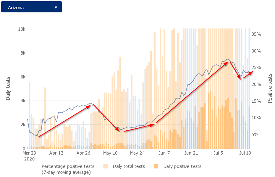 These charts from John Hopkins have different scales. While the 7-day trend did improve in Arizona, keep in mind that's still close to 1/4 of all tests coming back positive.