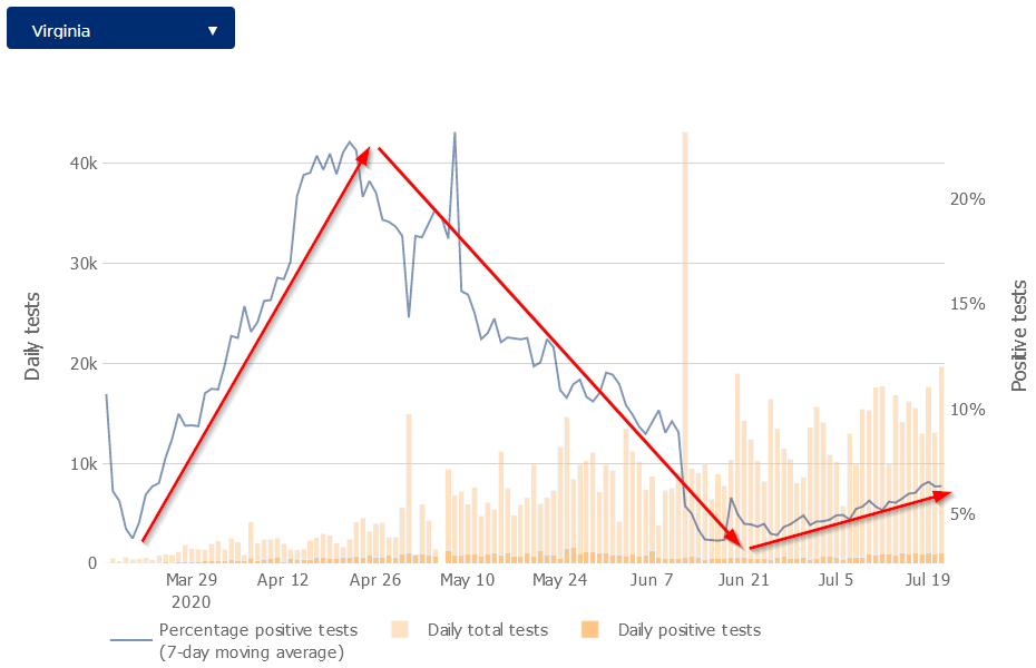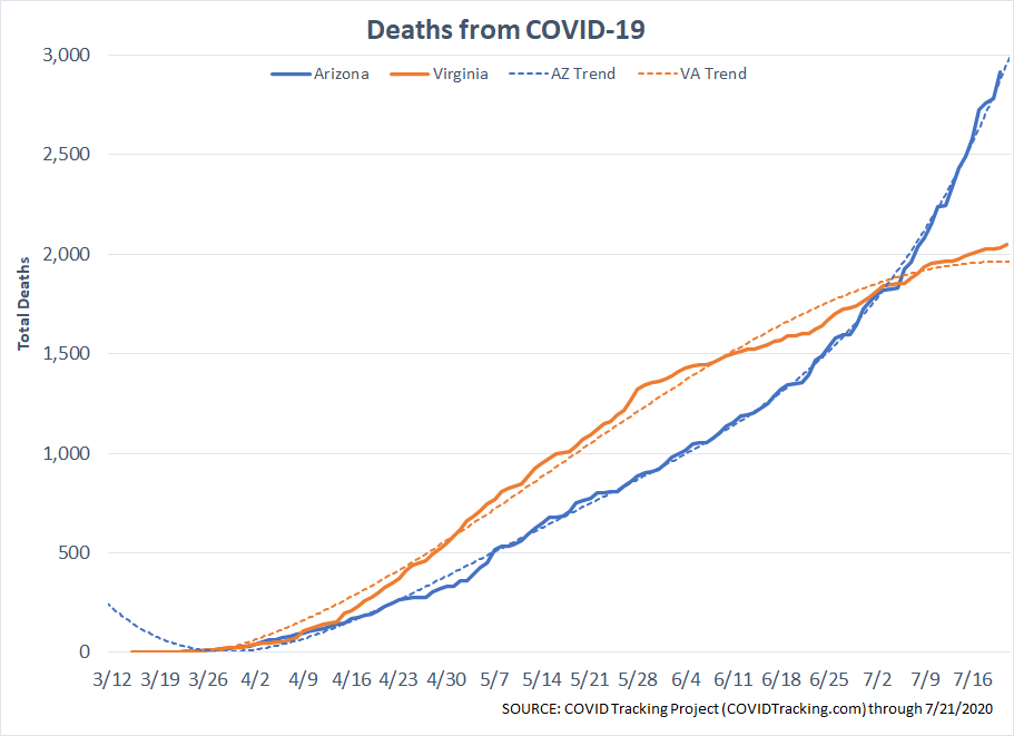 With offices and friends/family in both Virginia and Arizona I've been watching these two states closely. Arizona has been in the national news due to their outbreak. This didn't surprise me at all. I commented on March 25 that the attitude in Arizona was that the virus was not a big deal. The culture in Arizona is similar to Texas in that the people do not want the government telling them what to do.