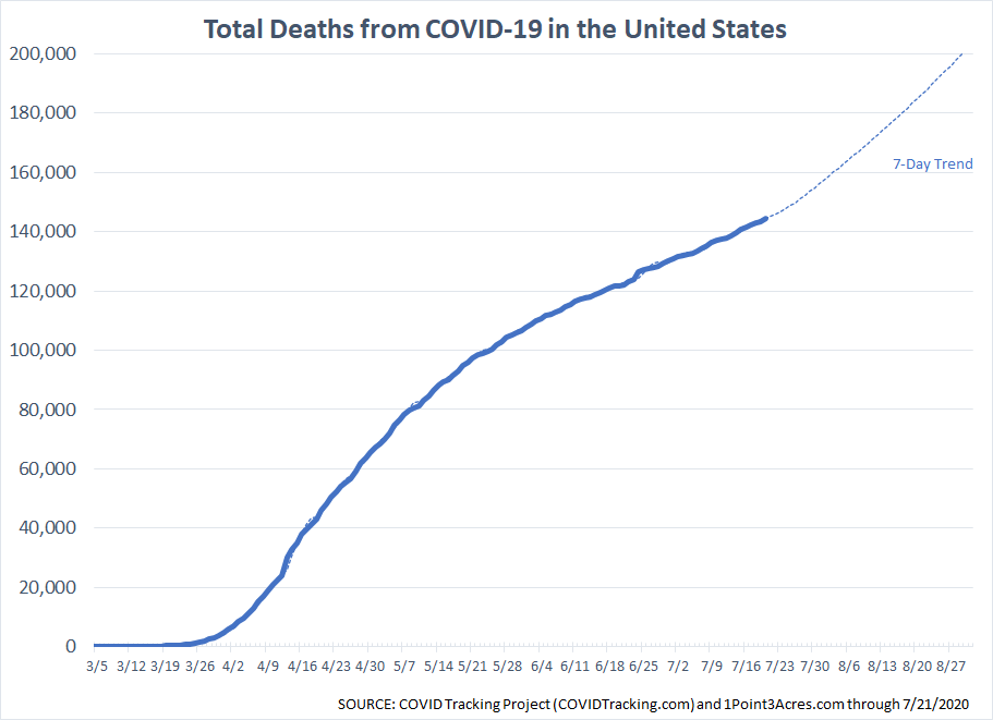 I realize many people question the test results. I've even seen some question hospitalizations. What is difficult to question is the number of deaths. Whether they are due to preexisting conditions or not, it is still somebody who died sooner than they would have without COVID19. I've been tracking these since early April when the President warned about 100,000 - 240,000 deaths. He had been spooked by both a couple of close business associates dying from COVID19 as well as some models that showed without any precautions deaths would go exponential.