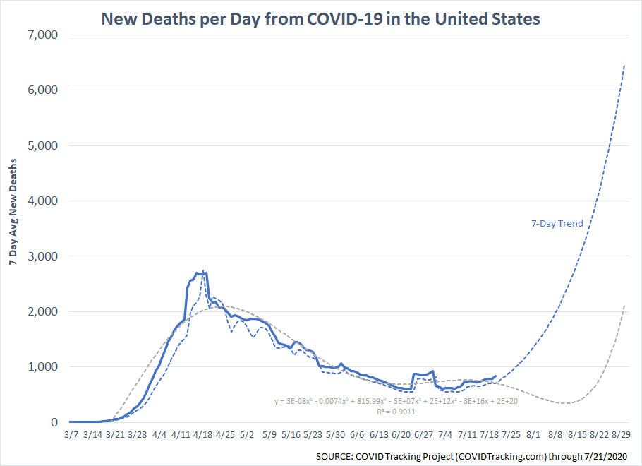 The deaths per day also had been trending downward and one model had them down to zero by the end of July, but is now showing a likely increase over the next month.