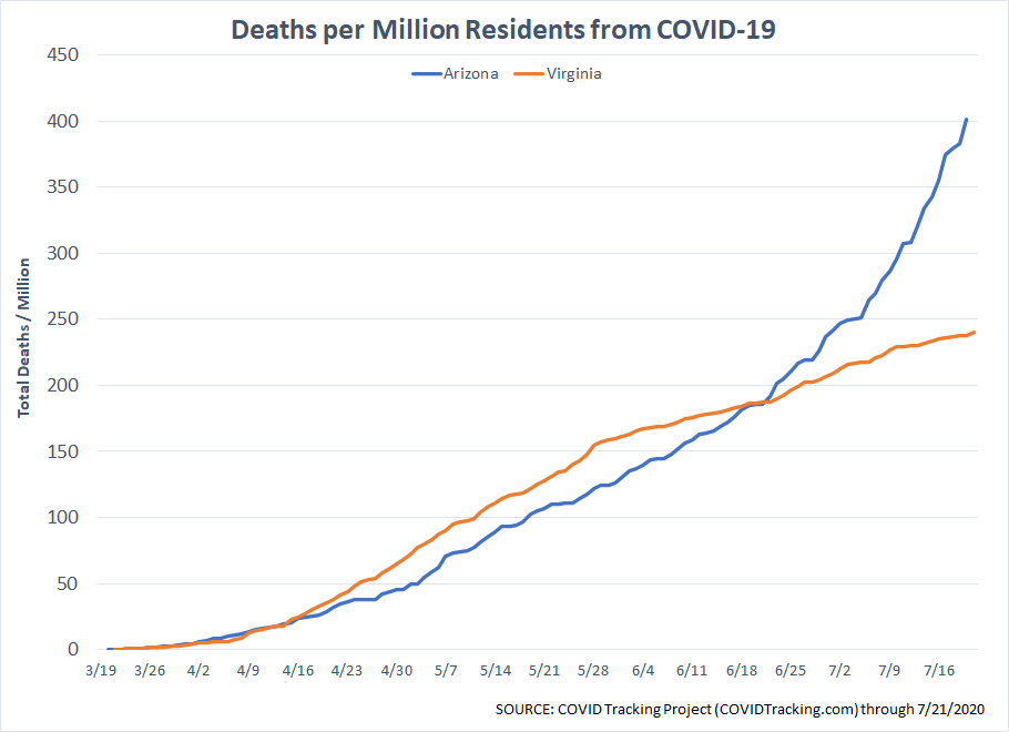 When you factor in the fact there are 2.5 million MORE people in Virginia than Arizona, this makes the difference even more glaring. When looking at the deaths per million people you really see what a curve flattening was designed to look like.